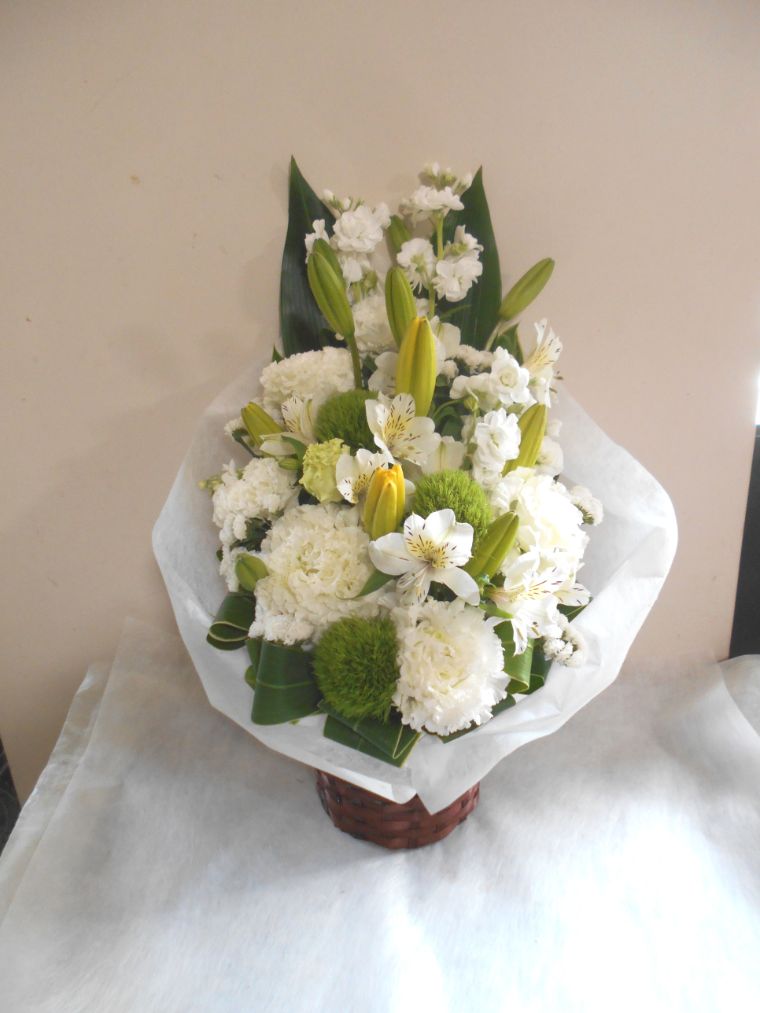 お悔やみ お供えの花 供花 (白ユリをメインにホワイト&グリーンでまとめたバスケットアレンジ)