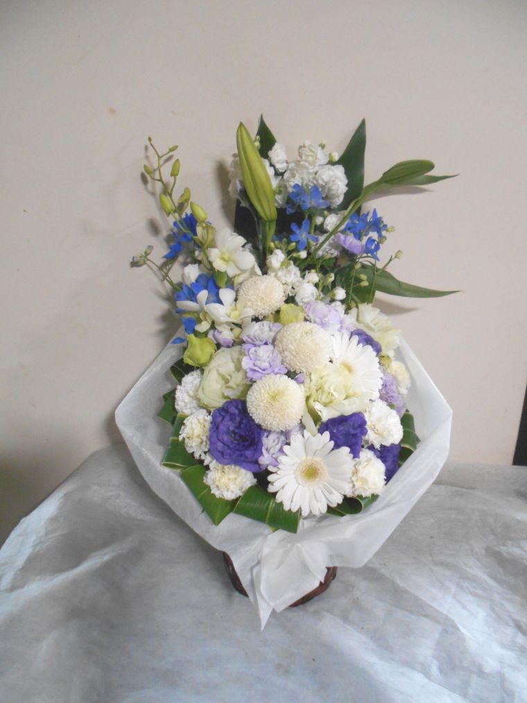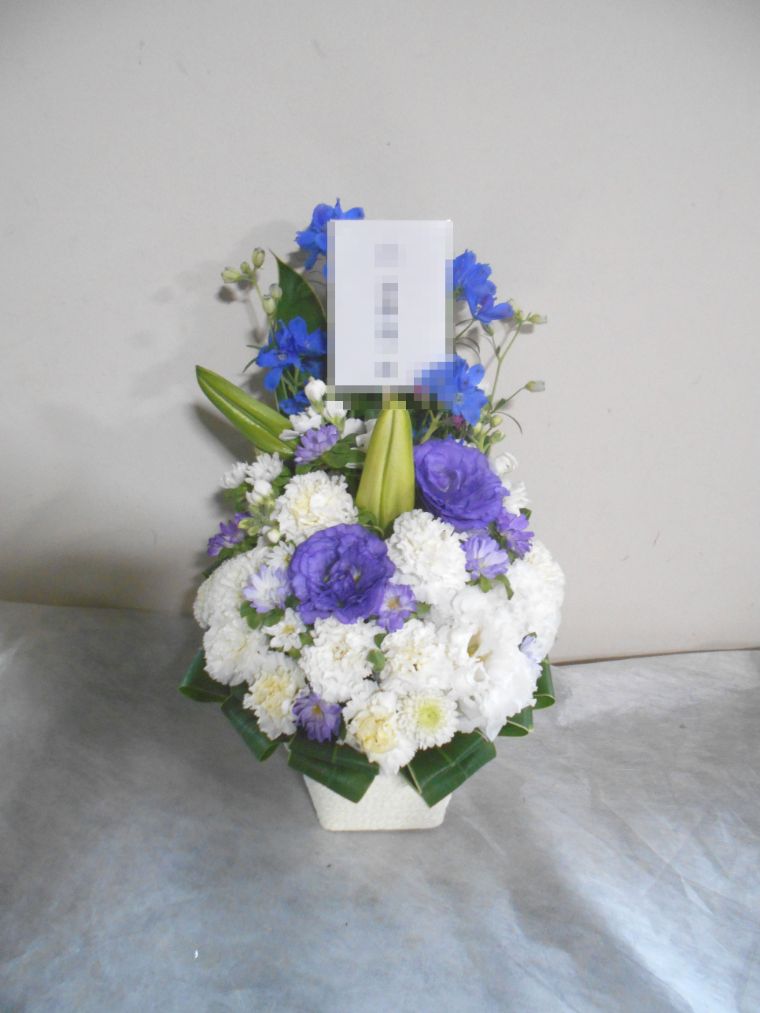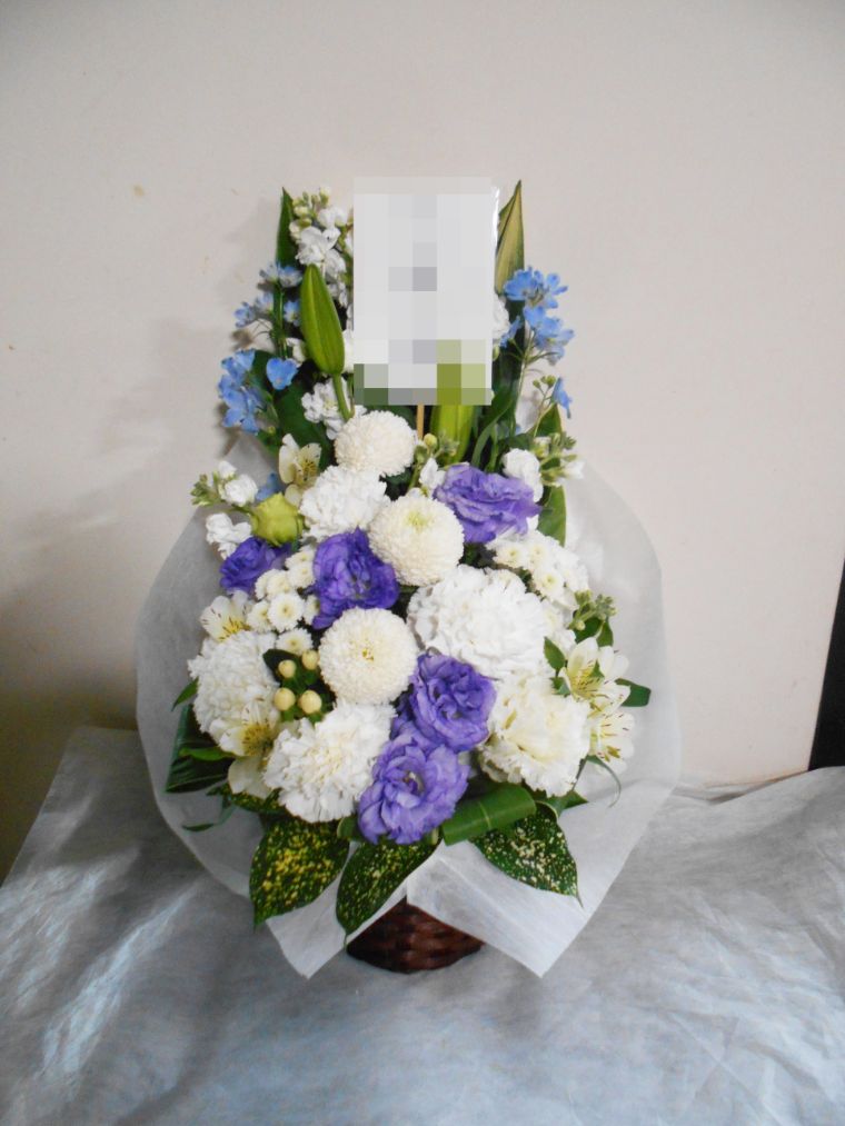 お悔やみ お供えの花 供花 (ホワイト&青・紫系カラーのお花でまとめたバスケットアレンジ)