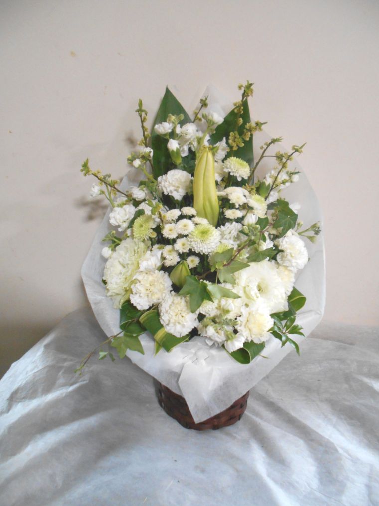 お悔やみ お供えの花 供花 (白ユリをメインにホワイト系でまとめたバスケットアレンジ)