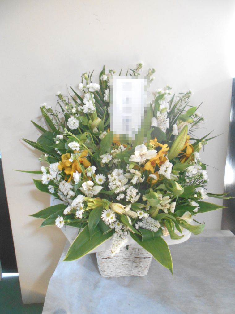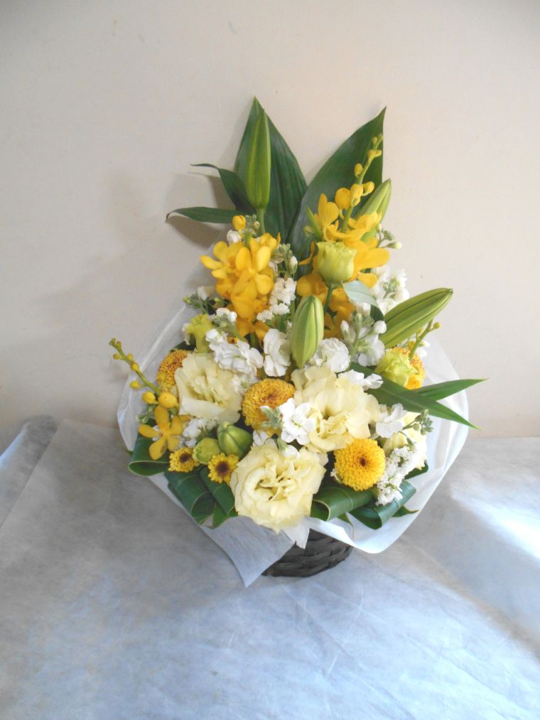 お悔やみ お供えの花 供花 (黄ユリをメインにホワイト系のお花でまとめたバスケットアレンジ)