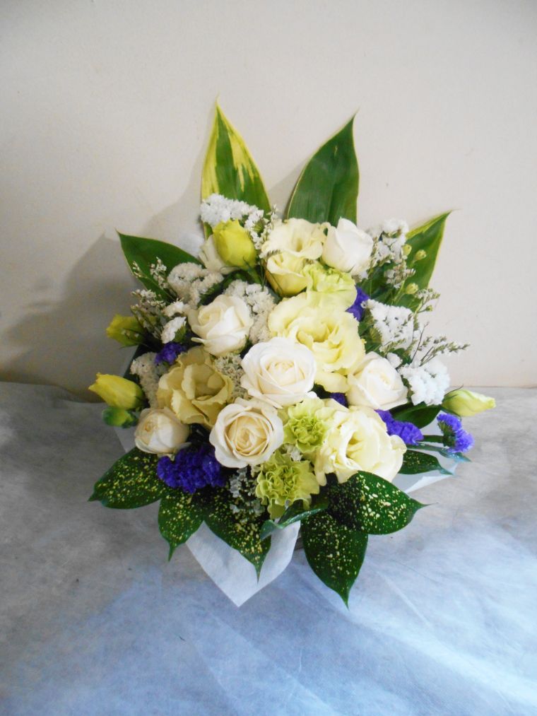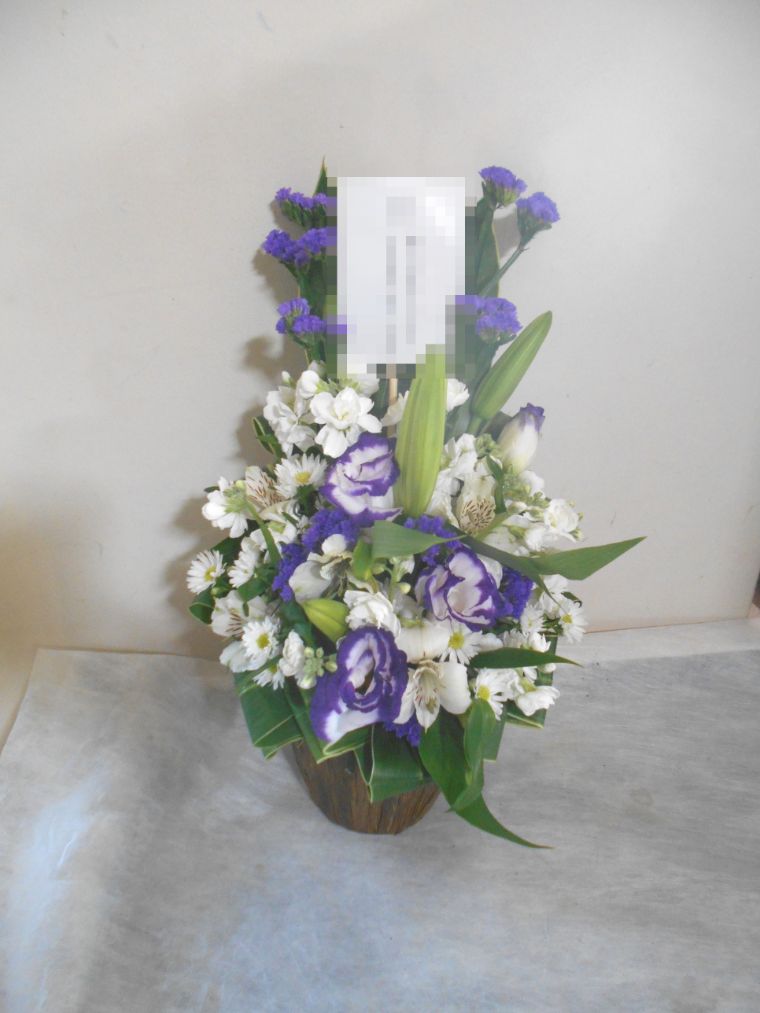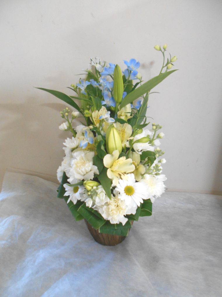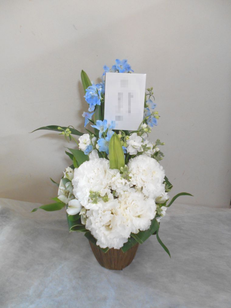 お悔やみ お供えの花 供花 (ホワイトにブルー系の挿し色を添えたバスケットアレンジ)