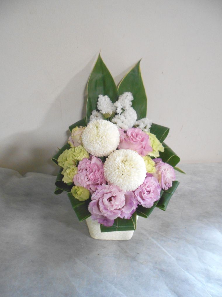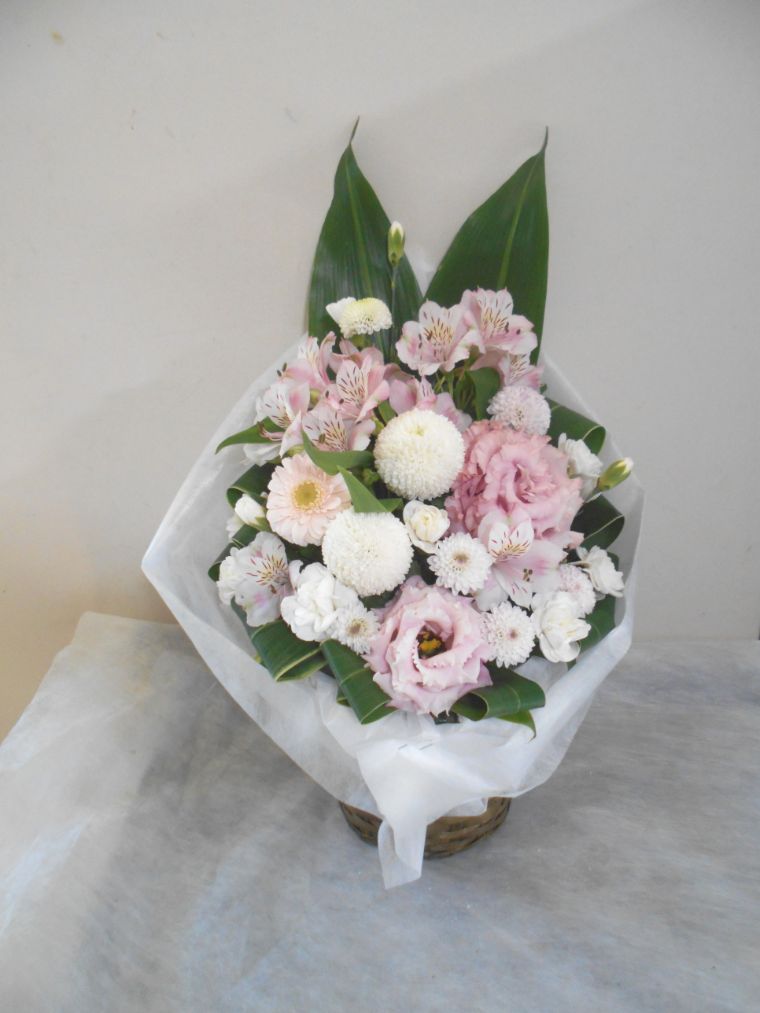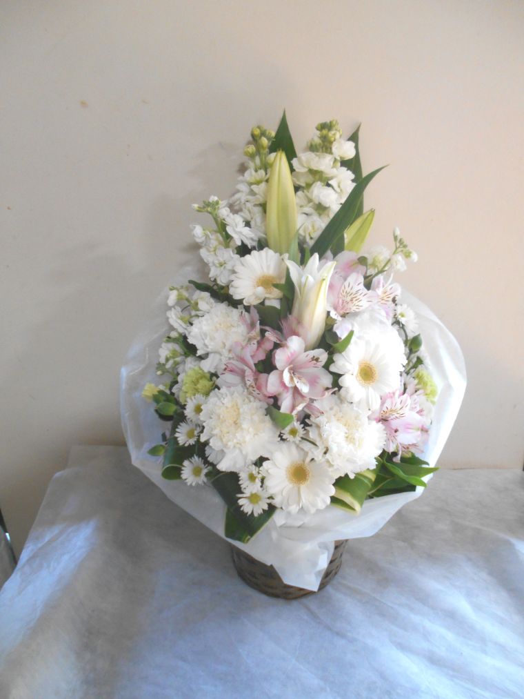 お悔やみ お供えの花 供花 (ホワイト&ピンクでまとめたバスケットアレンジ)