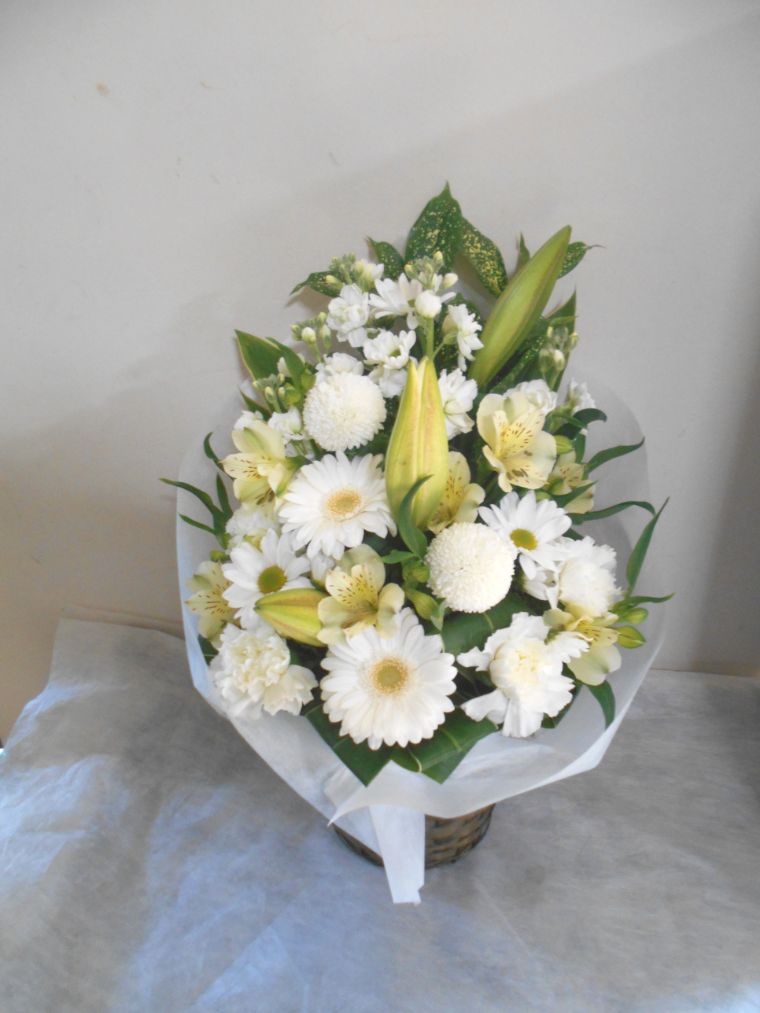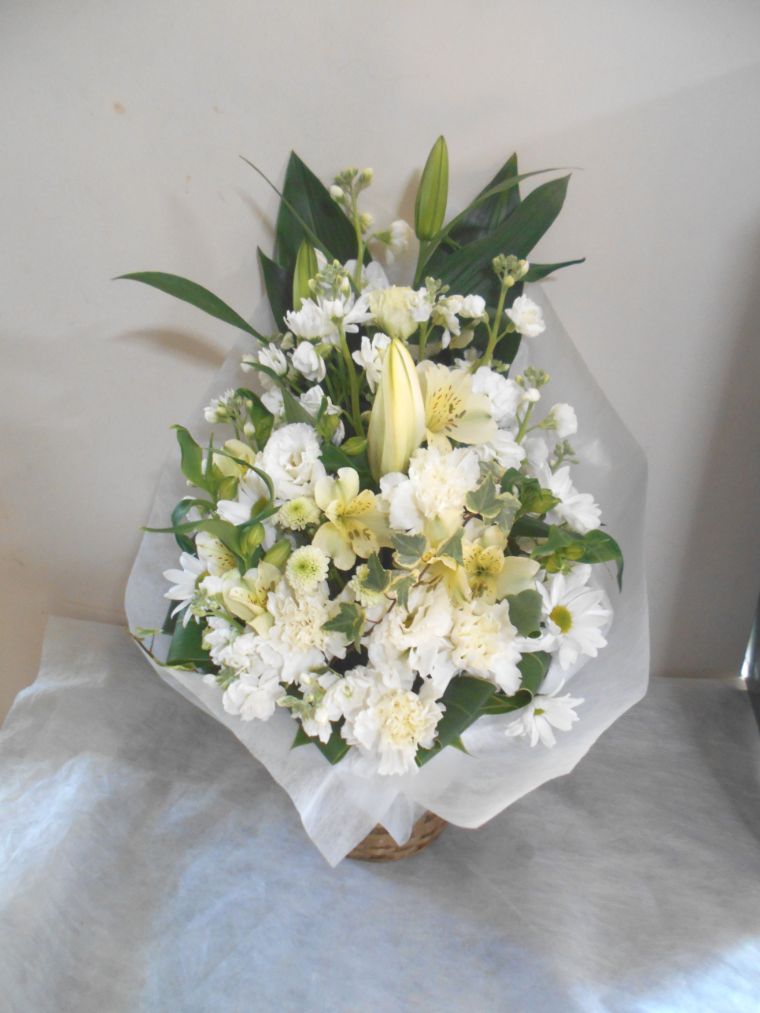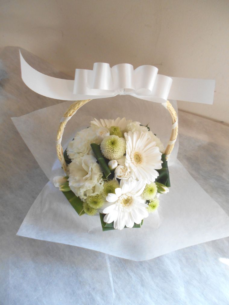 お悔やみ お供えの花 供花 (ホワイト&グリーンを基調にした手付きバスケットアレンジ)