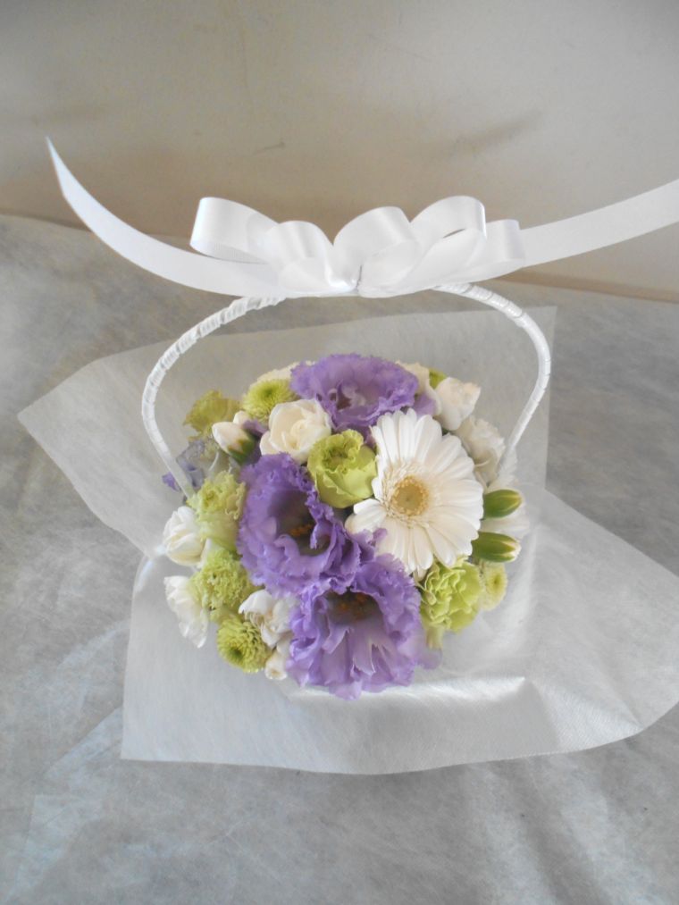 お悔やみ お供えの花 供花 (ホワイト&薄紫系でまとめた手付きのバスケットアレンジ)
