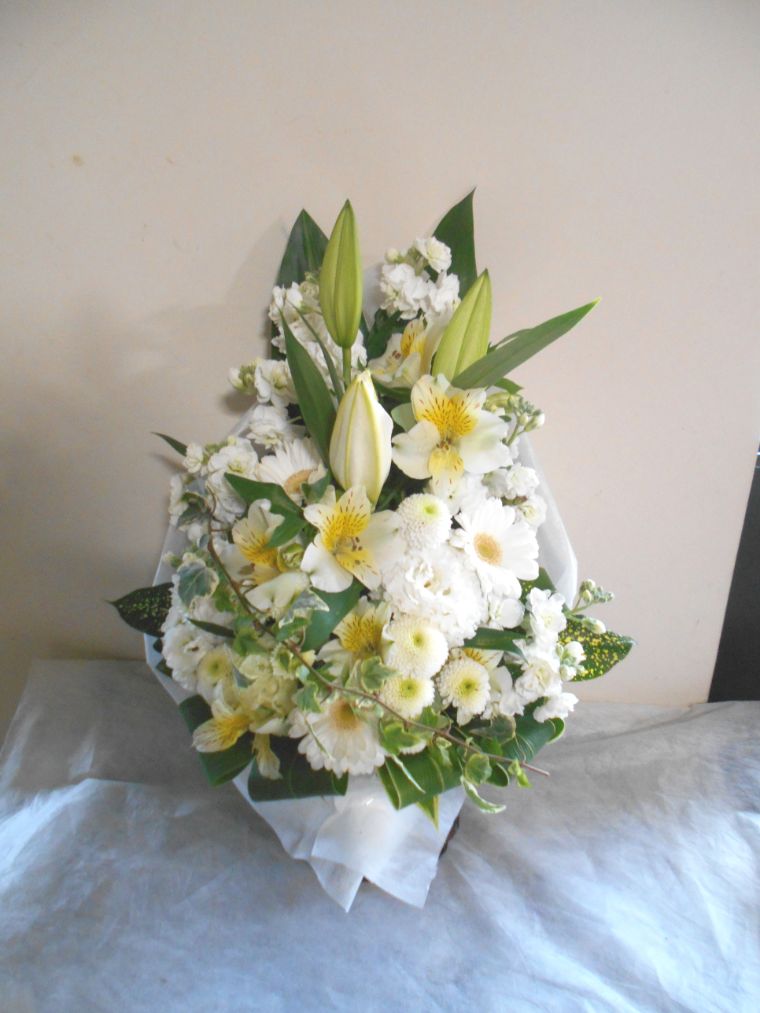 お悔やみ お供えの花 供花 (黄ユリをメインにホワイト系でまとめたアレンジ)
