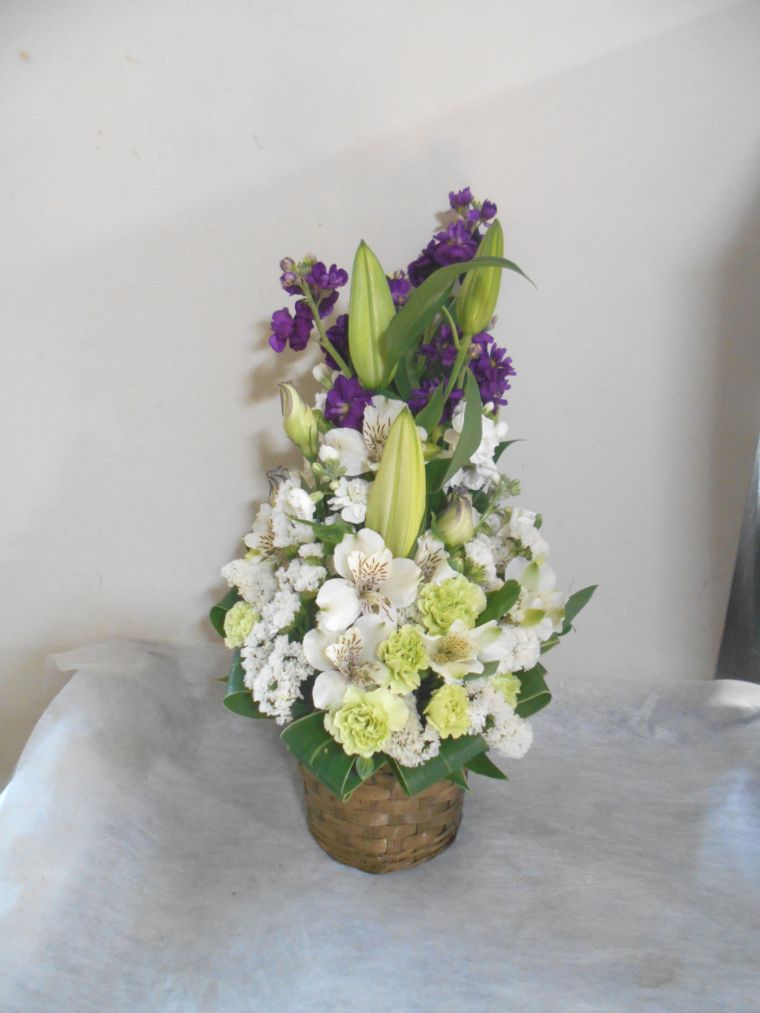 お悔やみ お供えの花 供花 (白基調でユリと紫系のお花をあしらったバスケットアレンジ)