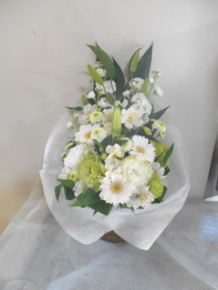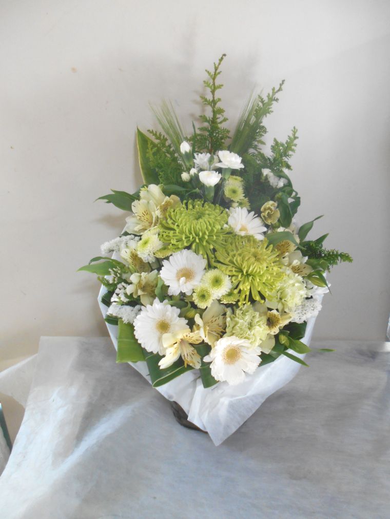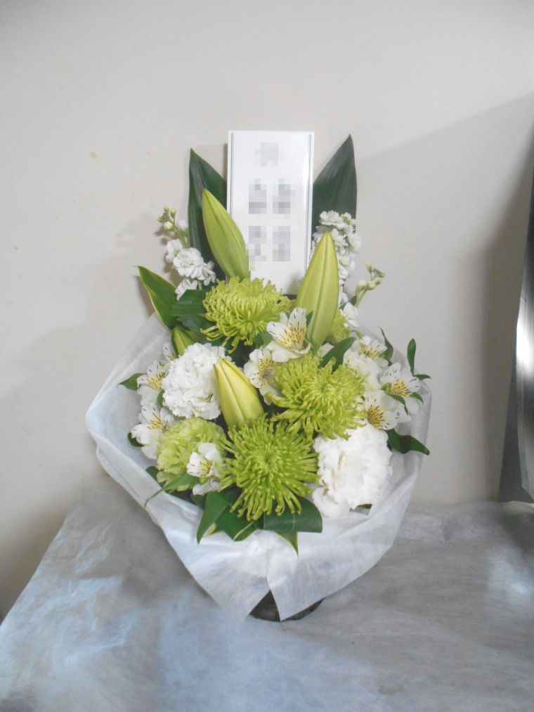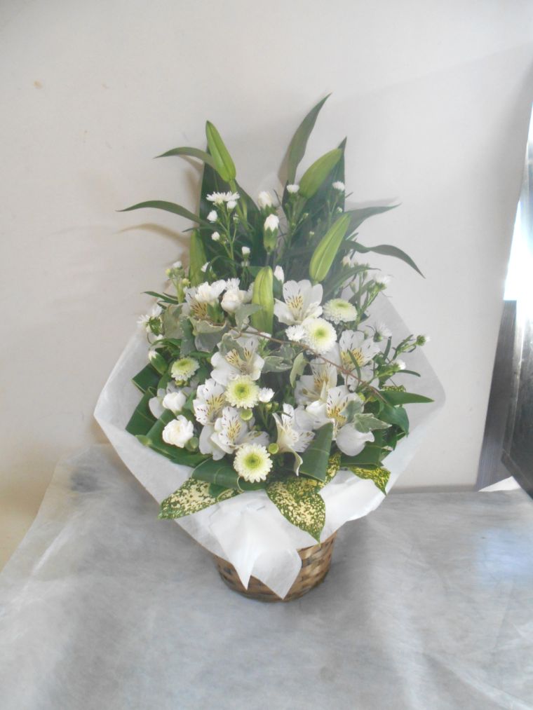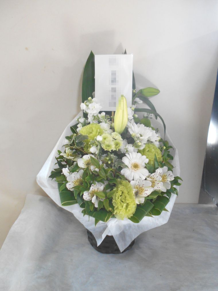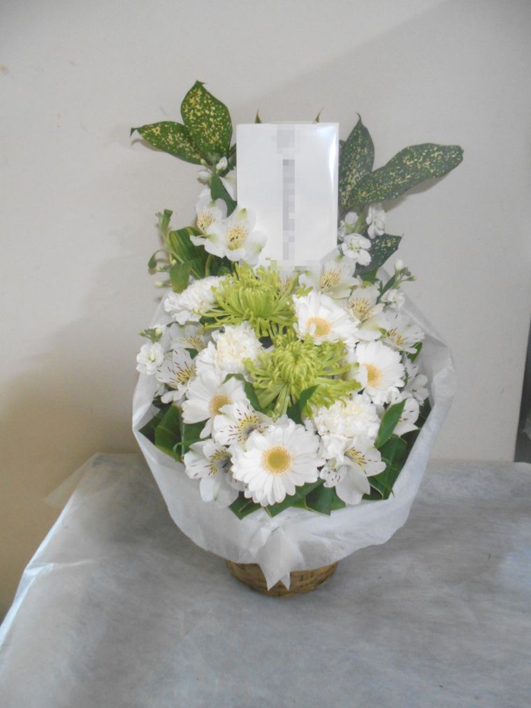お悔やみ お供えの花 供花 (ホワイト&グリーンを基調にしたバスケットアレンジ)