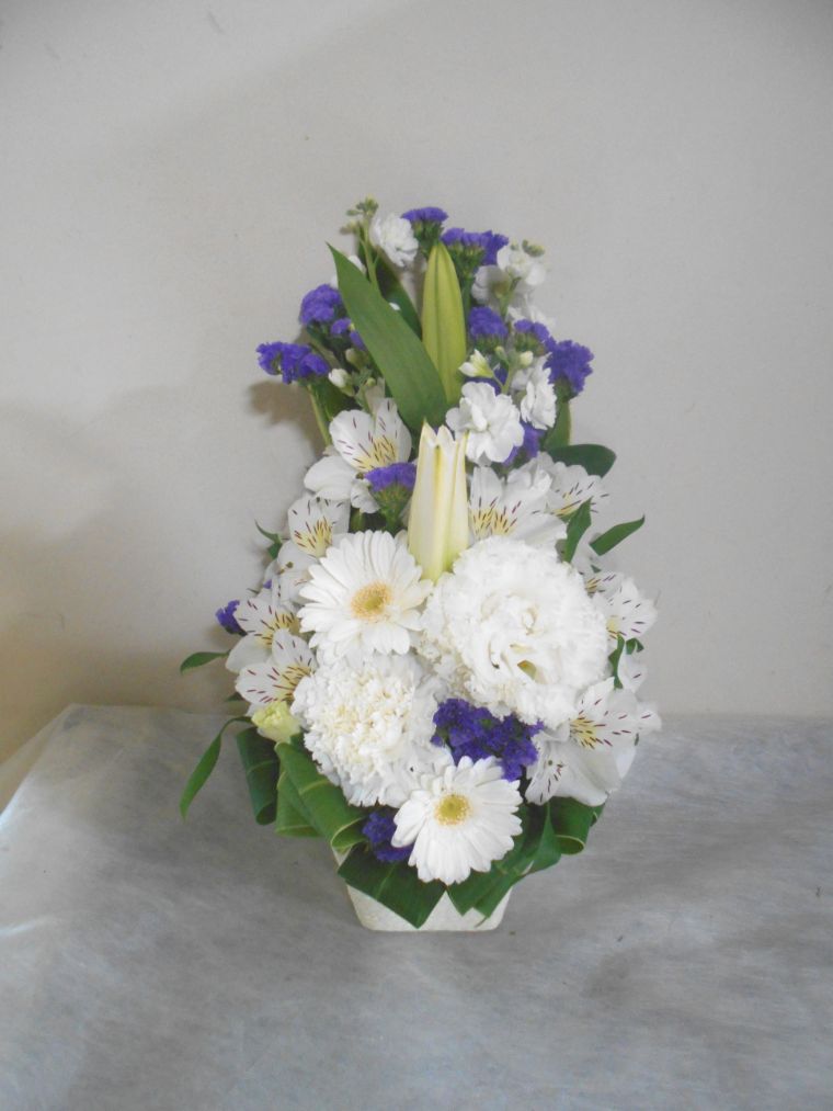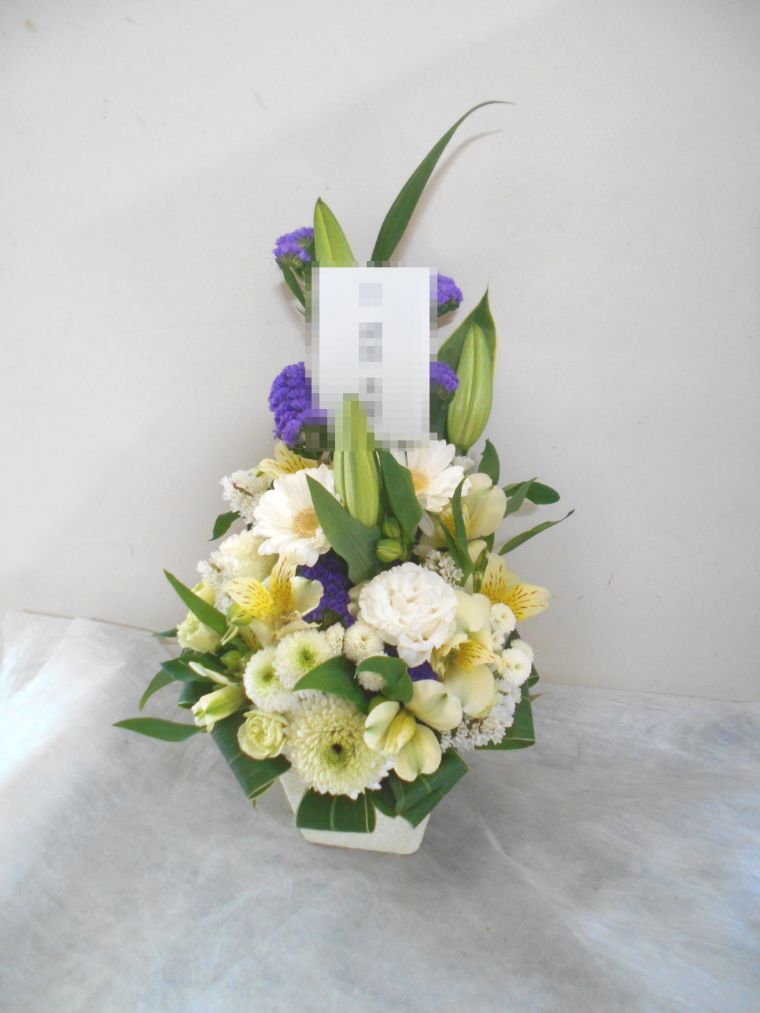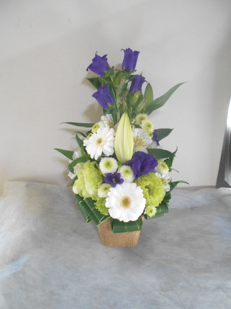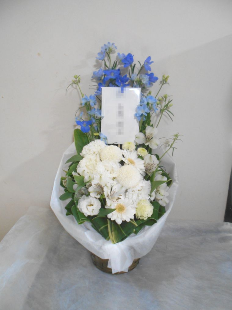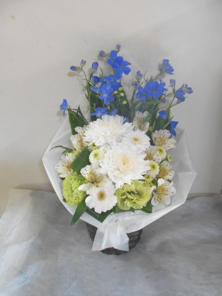 お悔やみ お供えの花 供花 (白基調に青系挿し色をそえたバスケットアレンジ)