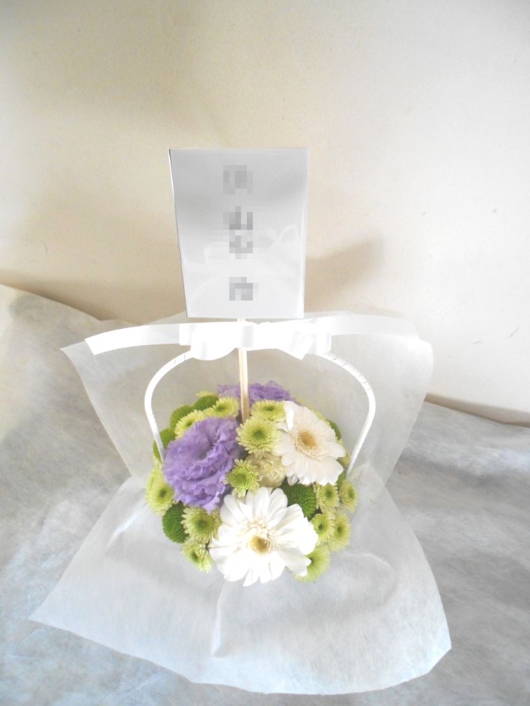 お悔やみ お供えの花 供花 (ホワイト&薄紫系でまとめた手付きのバスケットアレンジ)