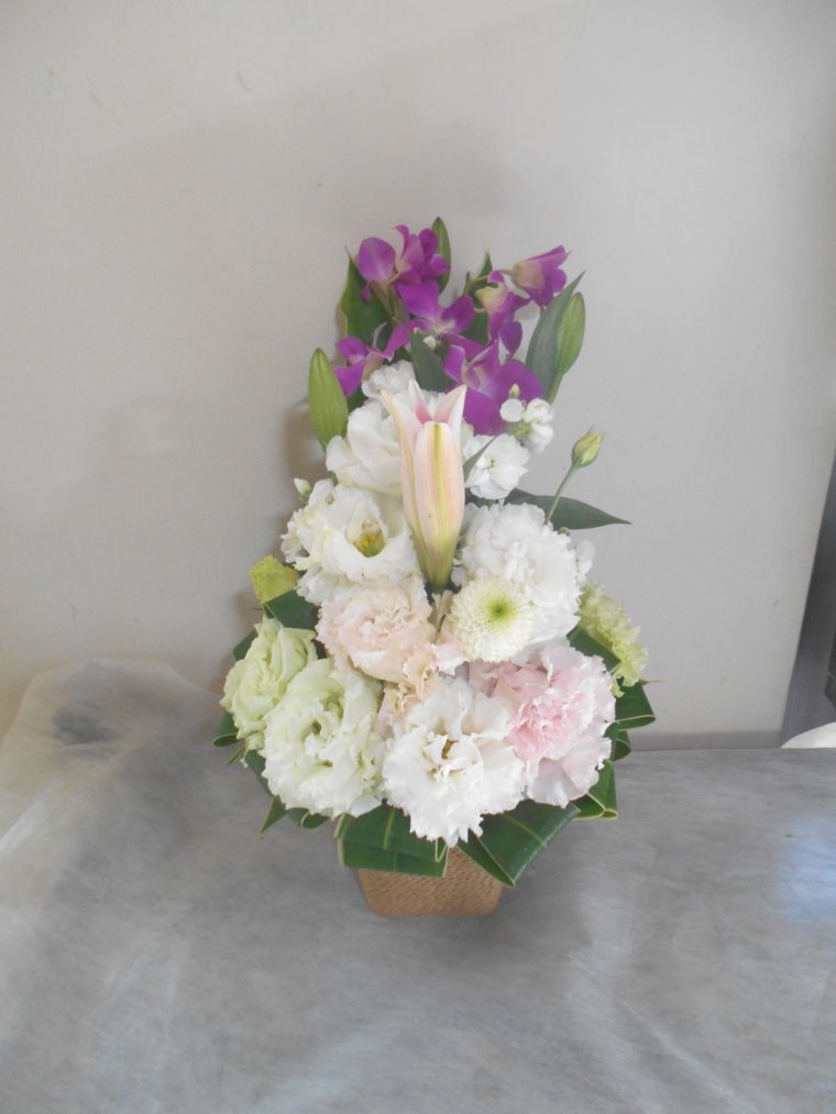 お悔やみ お供えの花 供花 (白基調でユリと紫系のお花をあしらったバスケットアレンジ)