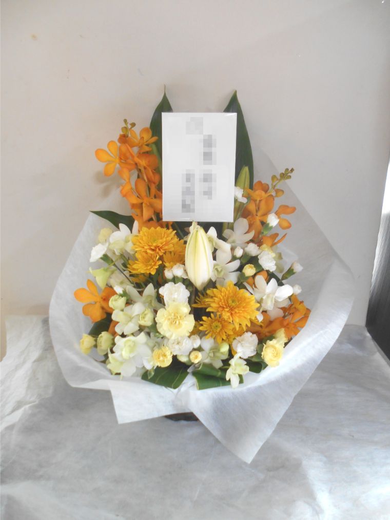 お悔やみ お供えの花 供花 (白ユリをメインに黄色の洋蘭をあしらったバスケットアレンジ)