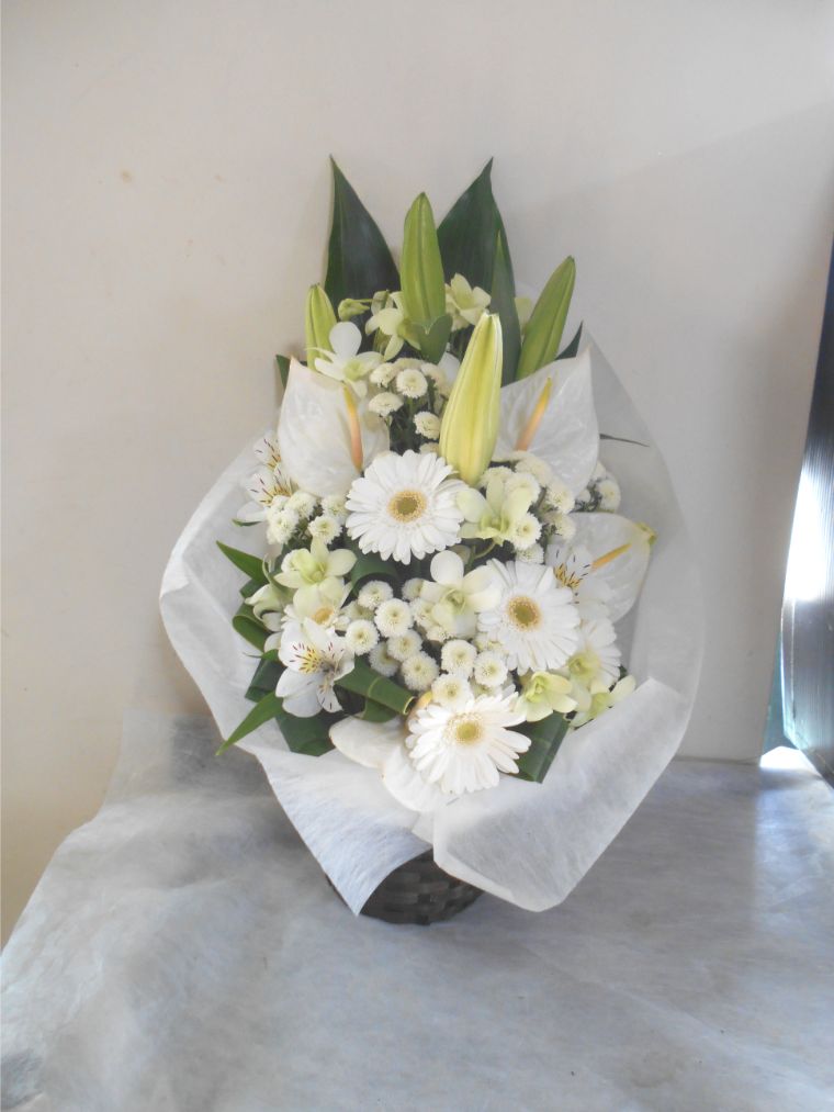 お悔やみ お供えの花 供花 (白いユリとガーベラをメインにホワイト&グリーンでまとめたバスケットアレンジ)
