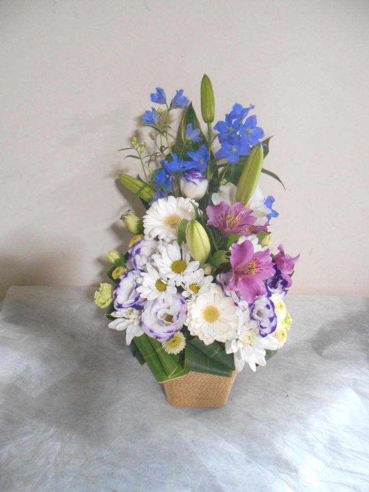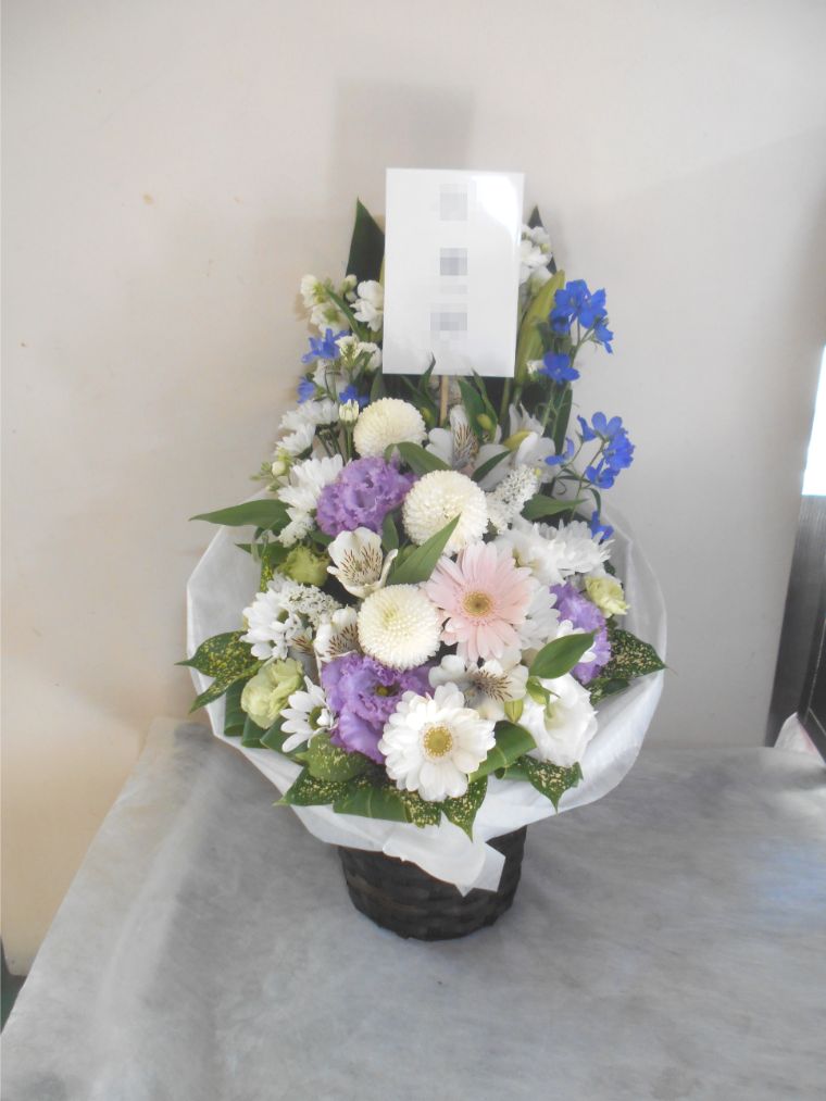 お悔やみ お供えの花 供花 (ホワイト&青・紫系カラーのお花でまとめたバスケットアレンジ)