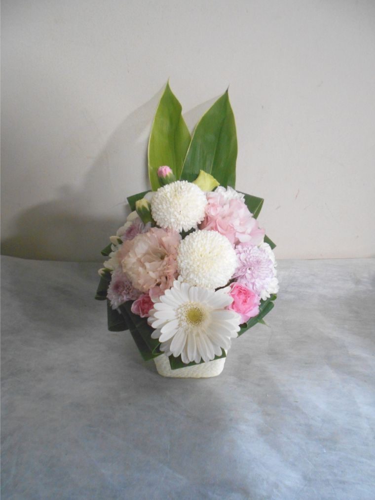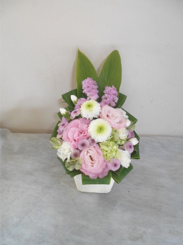 お悔やみ お供えの花 供花 (淡いピンク系のお花でまとめたバスケットアレンジ)