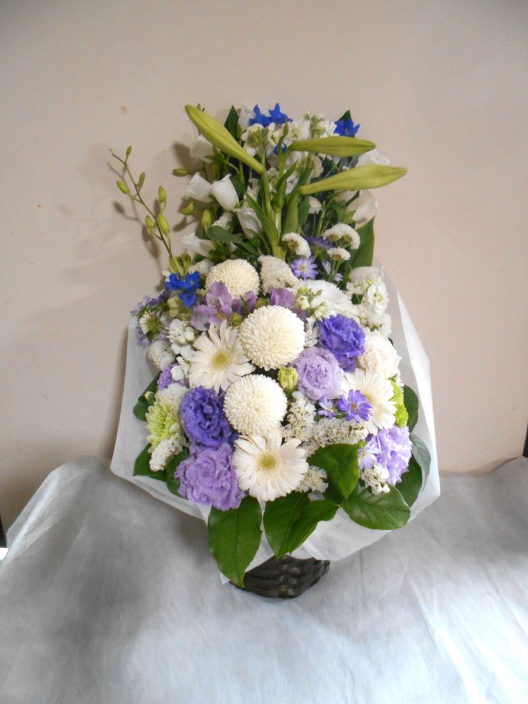 お悔やみ お供えの花 供花 (ホワイト&青・紫系カラーのお花でまとめたバスケットアレンジ)