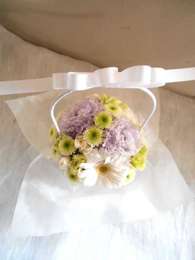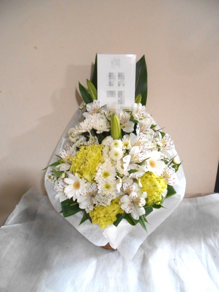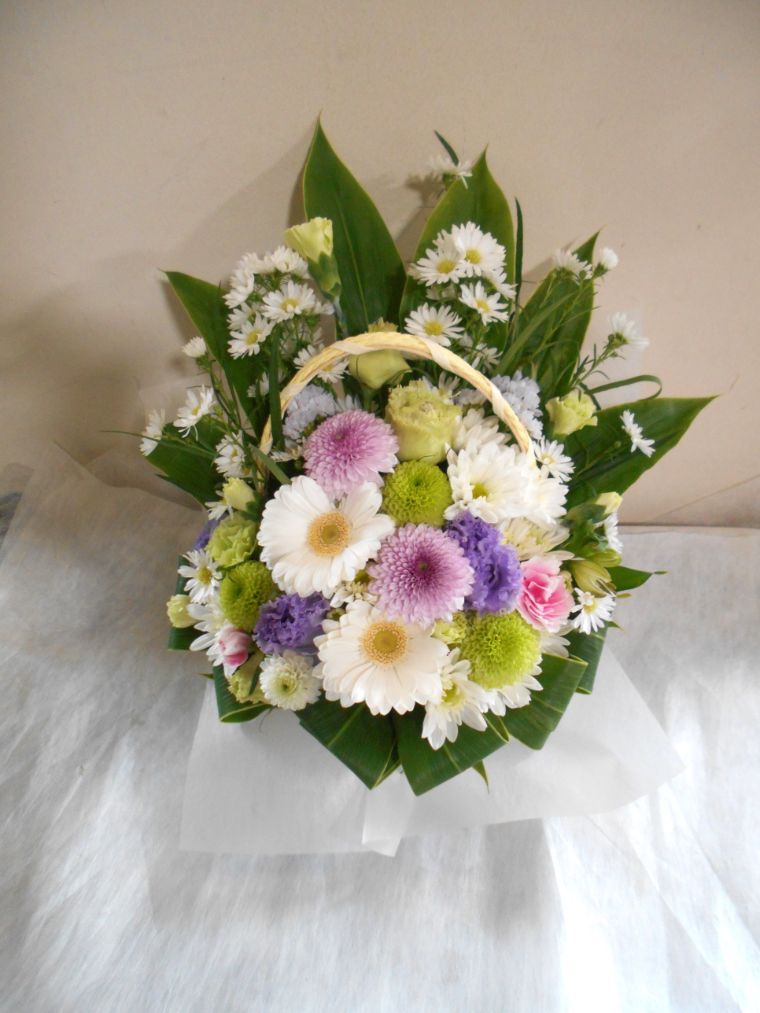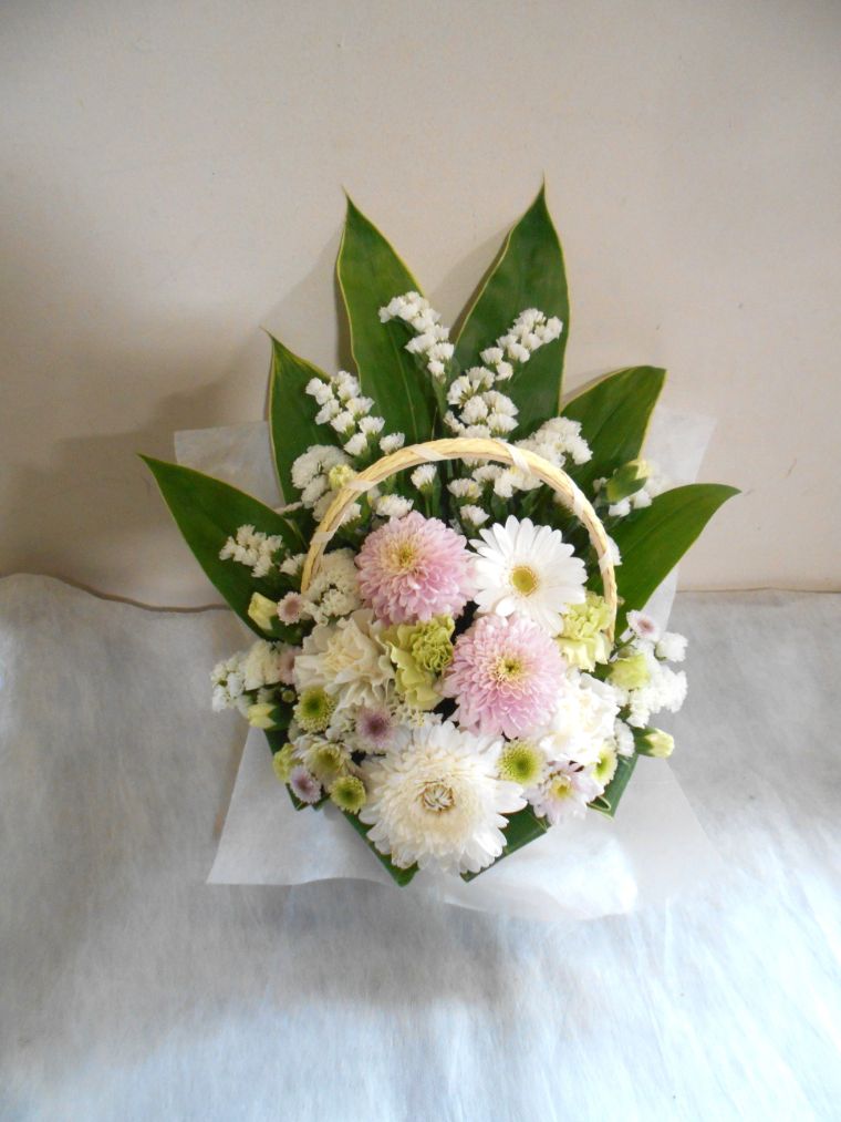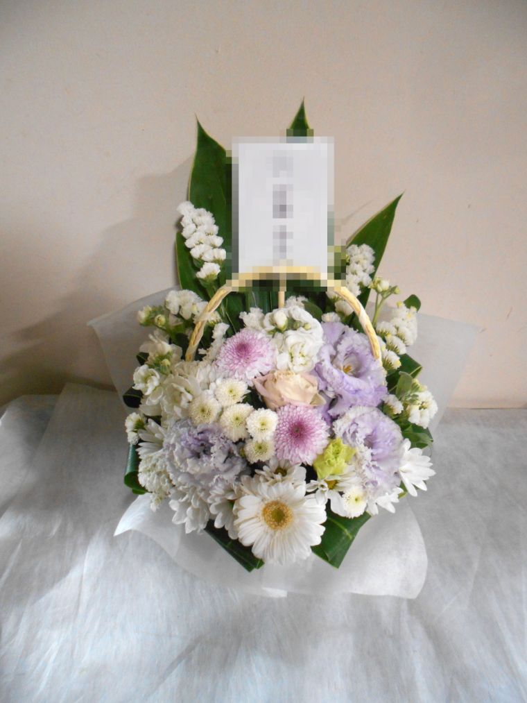 お悔やみ お供えの花 供花 (ホワイト&淡色カラーの手付きバスケットアレンジ)
