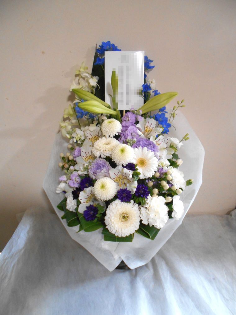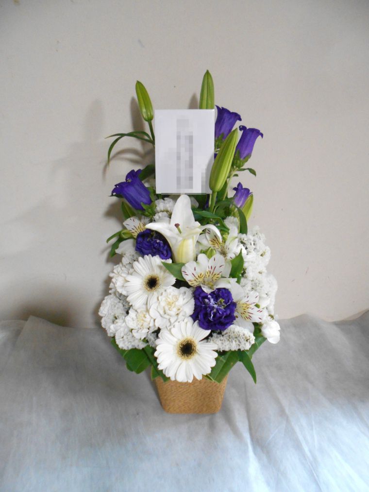 お悔やみ お供えの花 供花 (白基調に青系挿し色をそえたバスケットアレンジ)