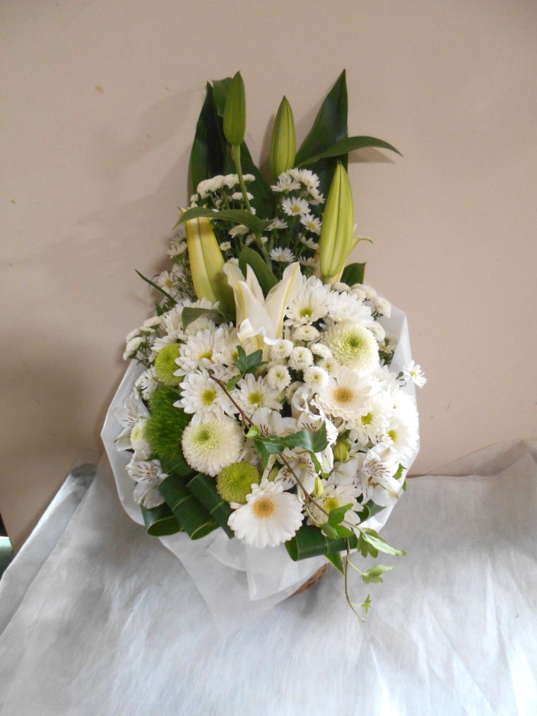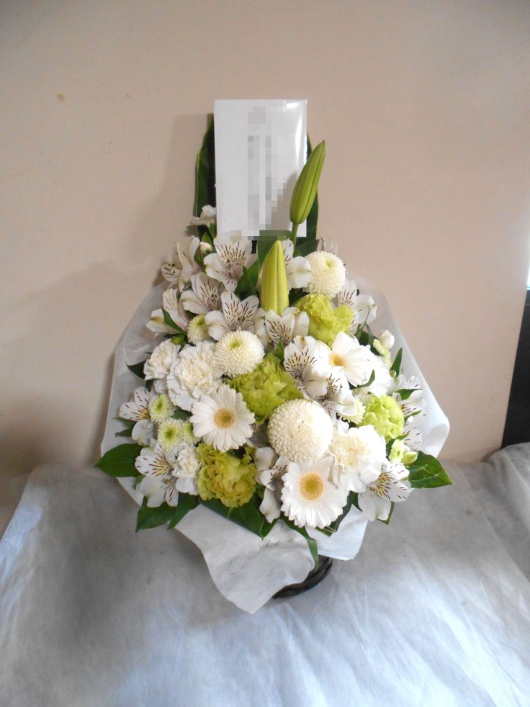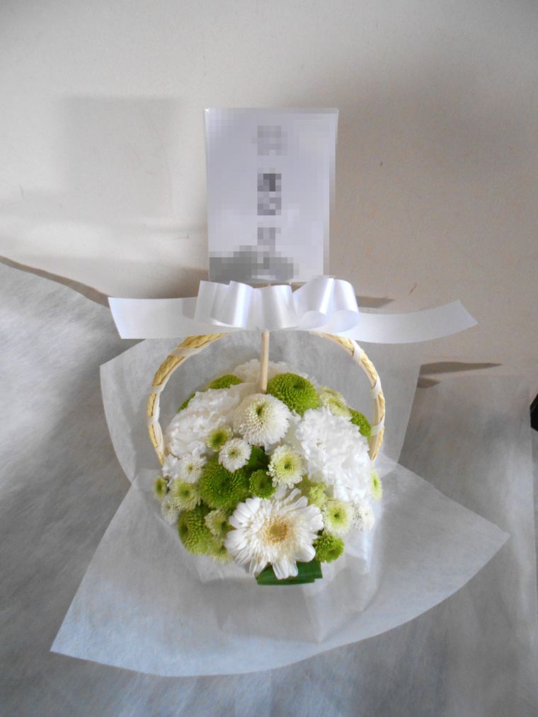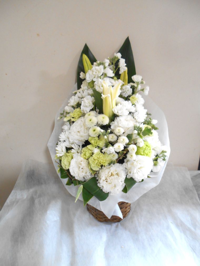 お悔やみ お供えの花 供花 (ホワイト&グリーンを基調にした手付きバスケットアレンジ)