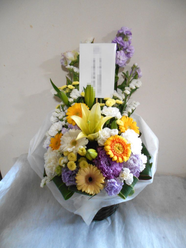 お悔やみ お供えの花 供花 (黄ユリをメインに淡色カラーでまとめたバスケットアレンジ)