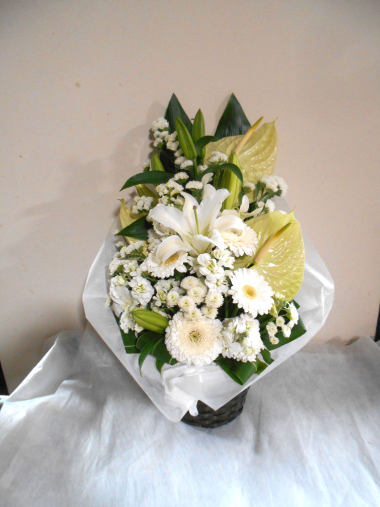 お悔やみ お供えの花 供花 (白いユリとガーベラをメインにホワイト&グリーンでまとめたバスケットアレンジ)