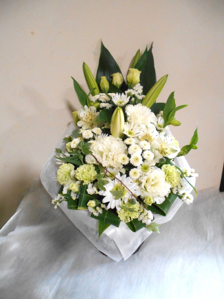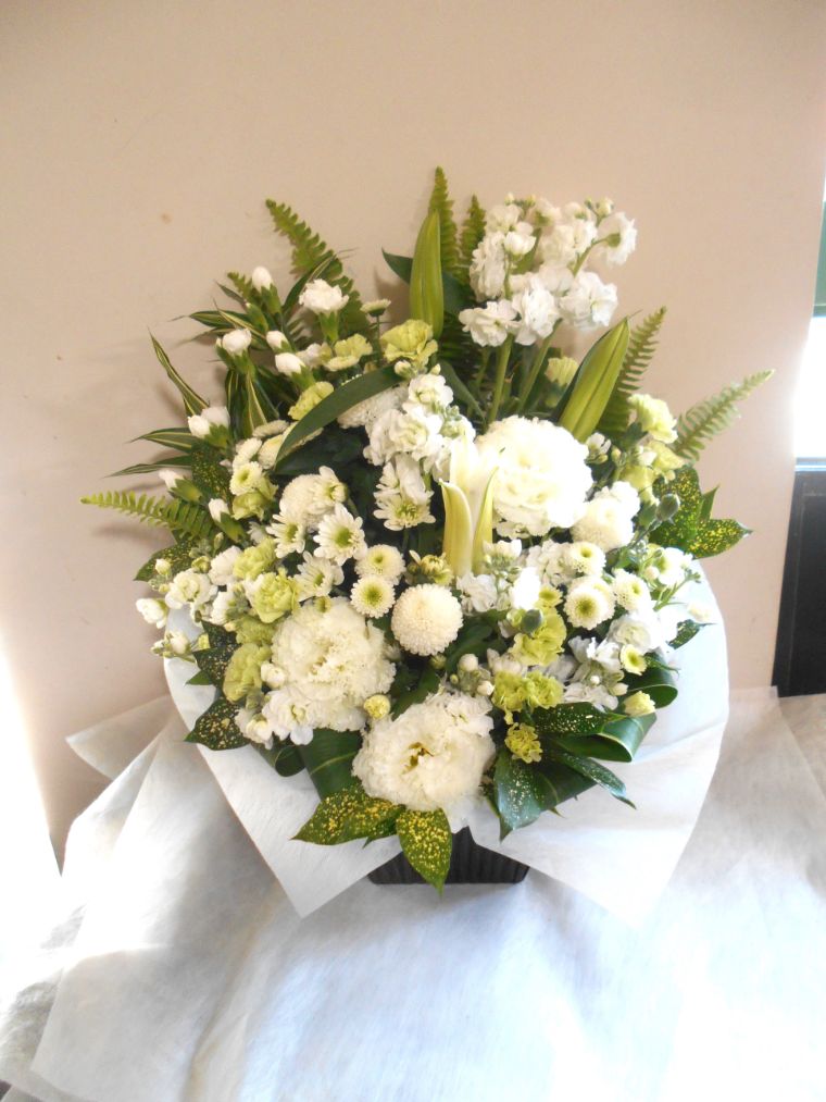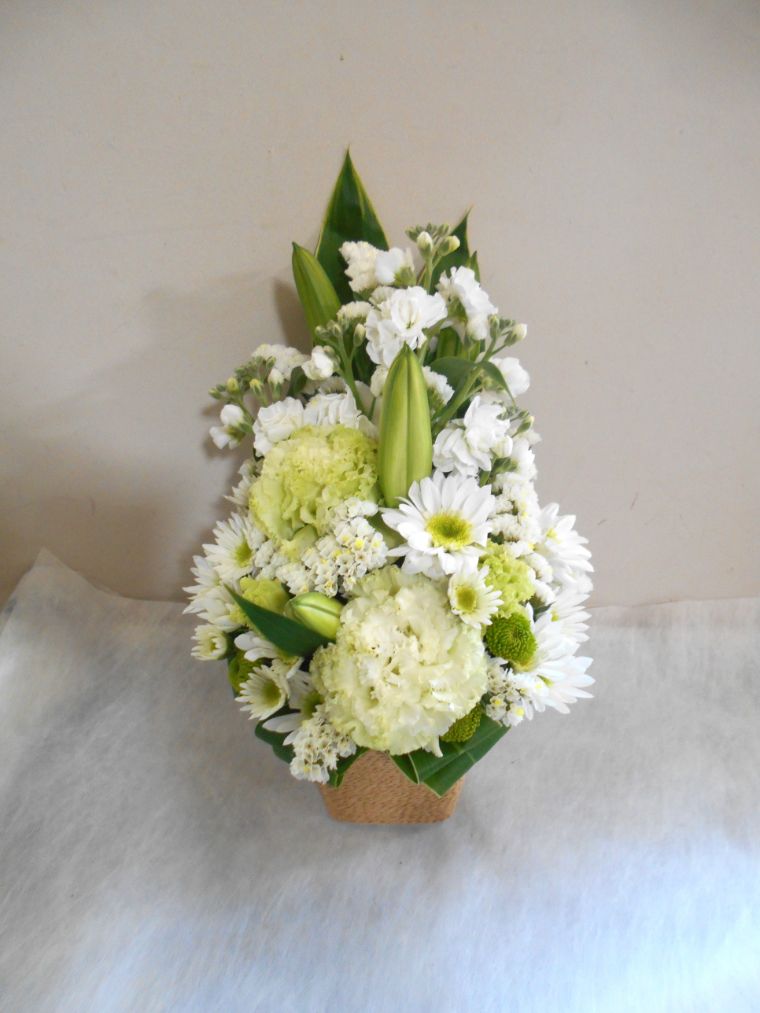 お悔やみ お供えの花 供花 (白ユリをメインにホワイト&グリーンでまとめたバスケットアレンジ)