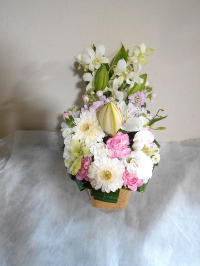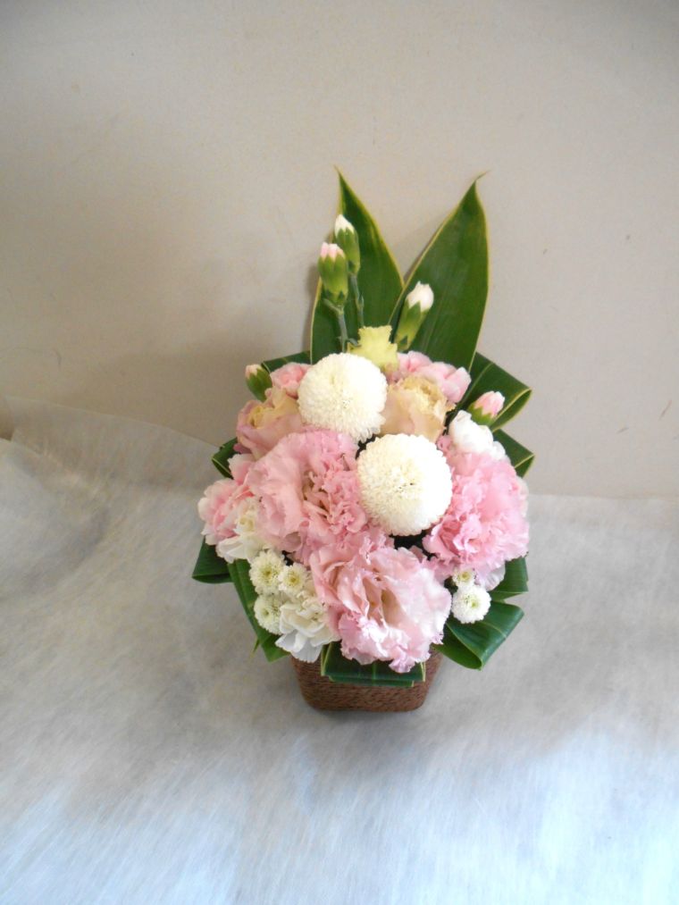 お悔やみ お供えの花 供花 (ホワイト&ピンクでまとめたバスケットアレンジ)