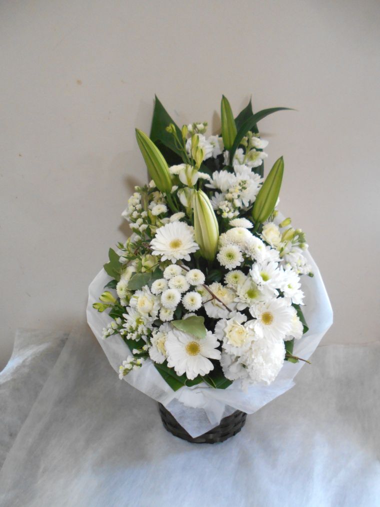 お悔やみ お供えの花 供花 (白基調でユリのお花をメインにしたバスケットアレンジ)