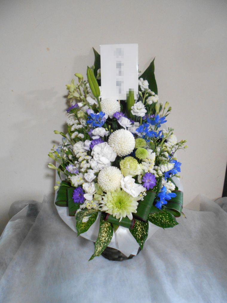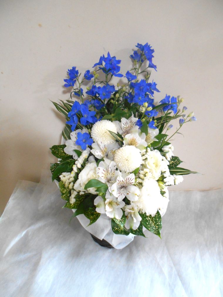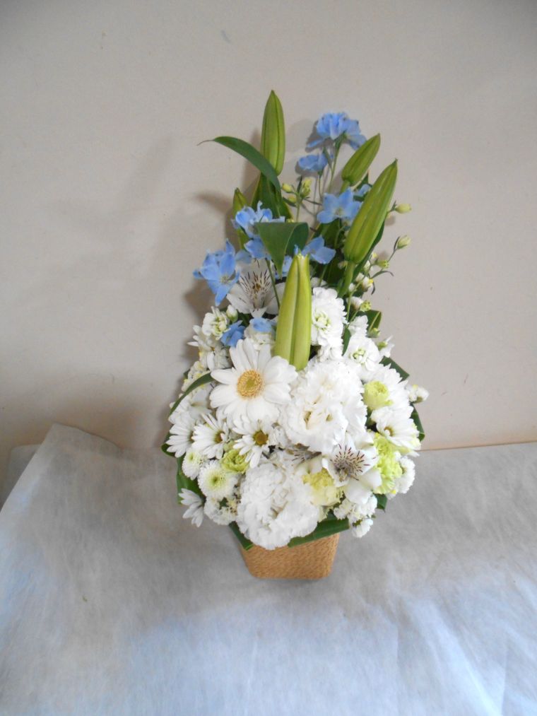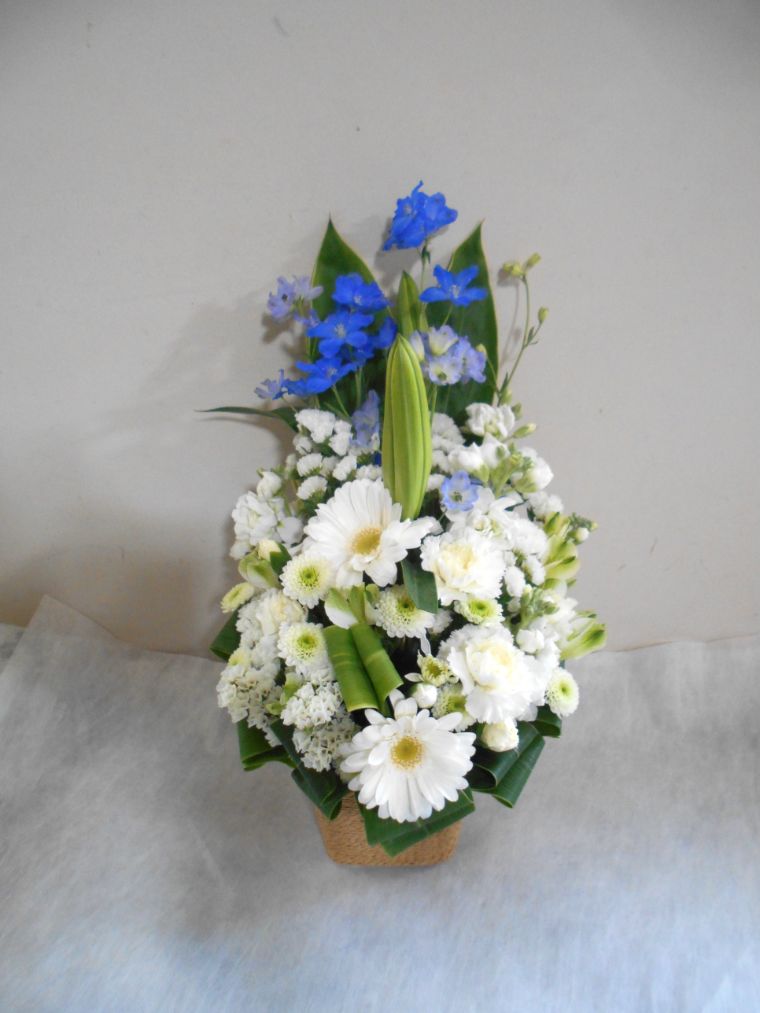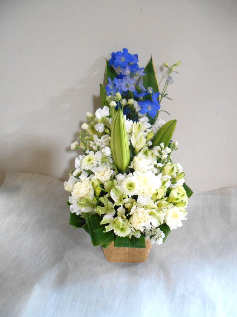 お悔やみ お供えの花 供花 (白基調に青系挿し色をそえたバスケットアレンジ)