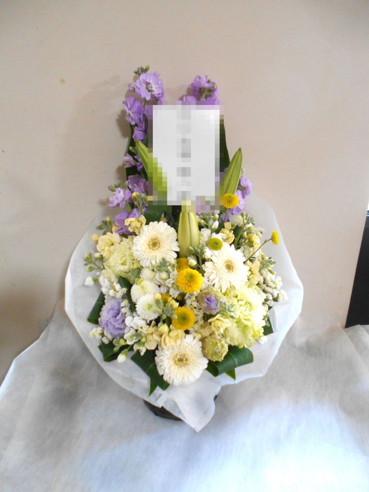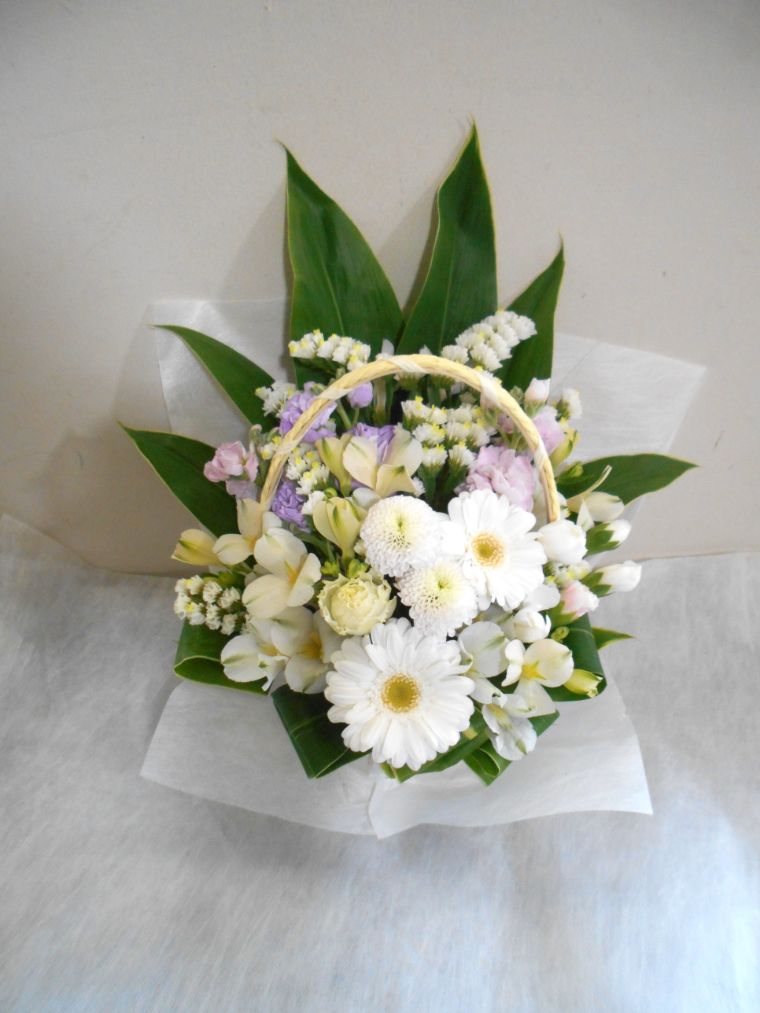 お悔やみ お供えの花 供花 (ホワイト&淡色カラーの手付きバスケットアレンジ)