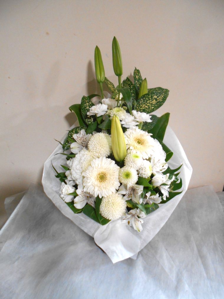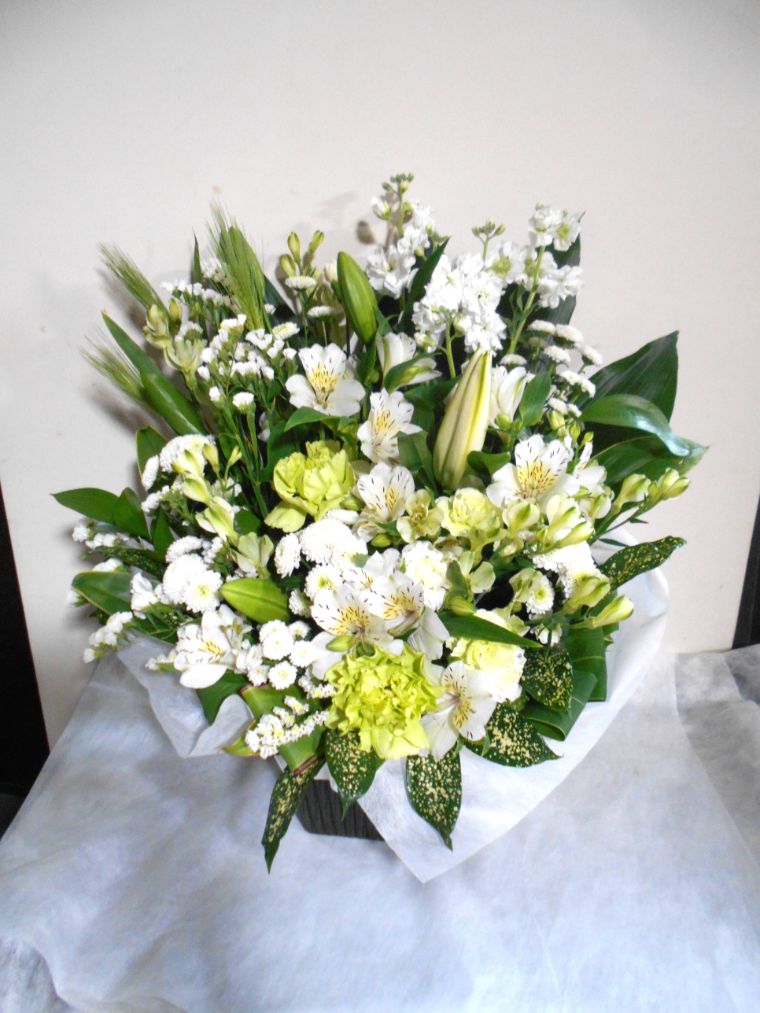 【白系】お悔やみ お供えの花 供花 (ホワイト&淡色カラーの手付きバスケットアレンジ)