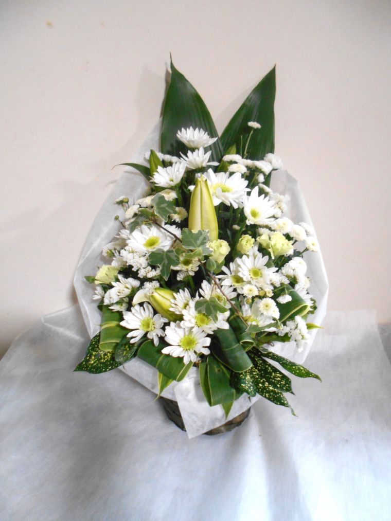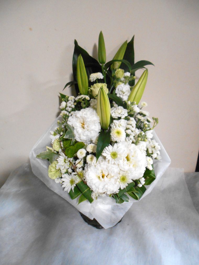 お悔やみ お供えの花 供花 (白ユリをメインにホワイト系にまとめた高さのあるバスケットアレンジ)