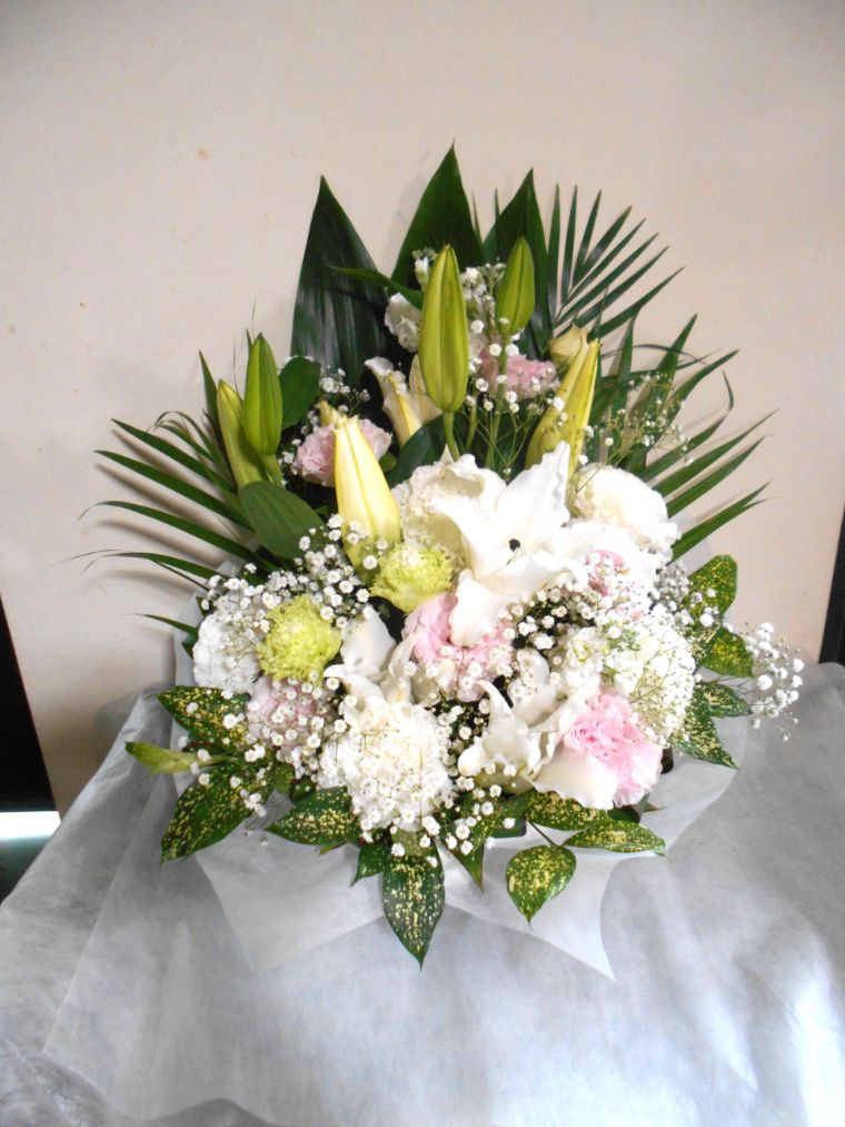 【白系】お悔やみ お供えの花 供花 (ユリをメインに白&ピンクでまとめたバスケットアレンジ)