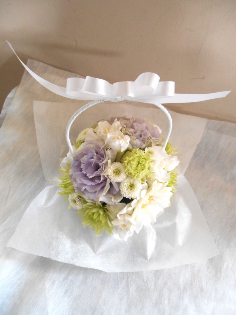 お悔やみ お供えの花 供花 (ホワイト&薄紫系でまとめた手付きのバスケットアレンジ)