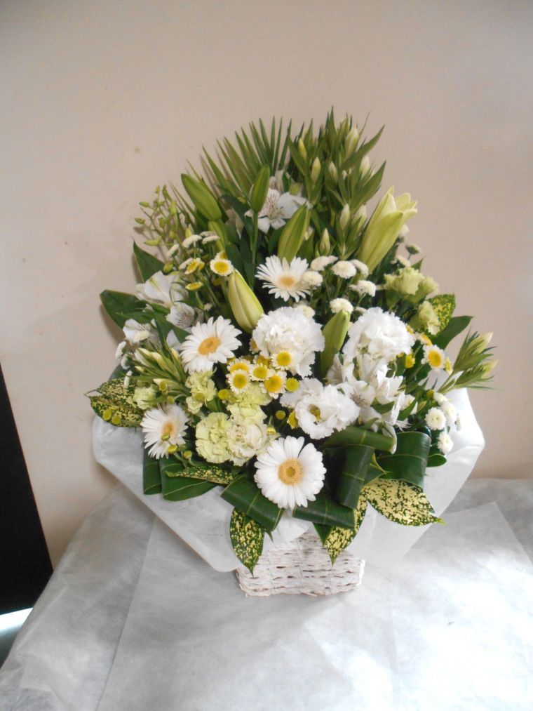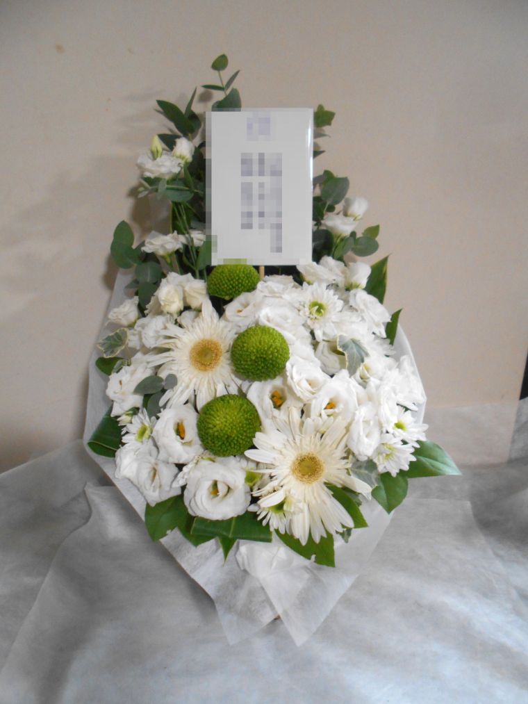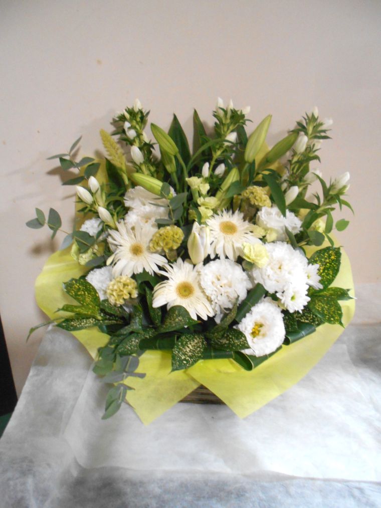 お悔やみ お供えの花 供花 (ホワイト&グリーンを基調にしたバスケットアレンジ)