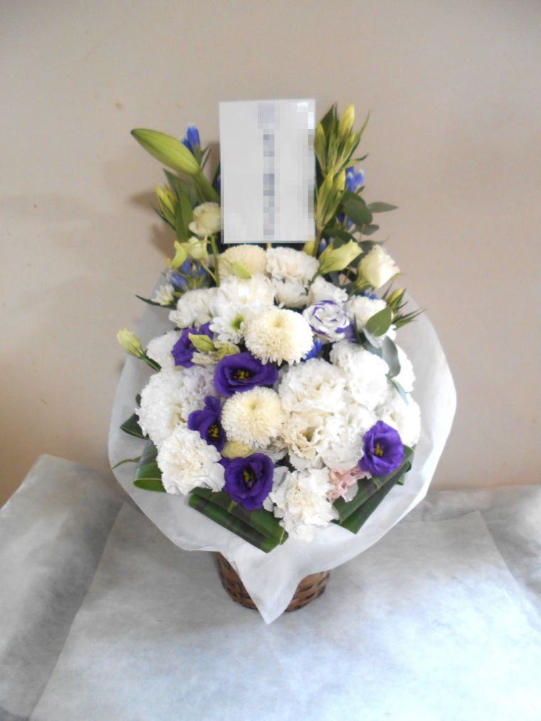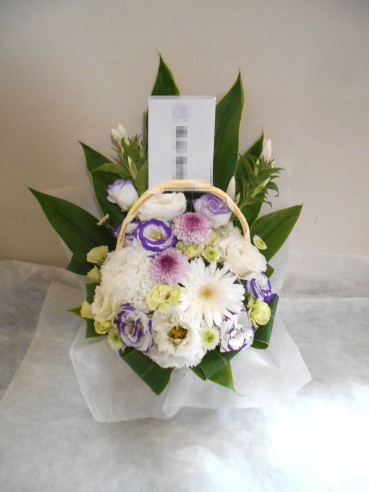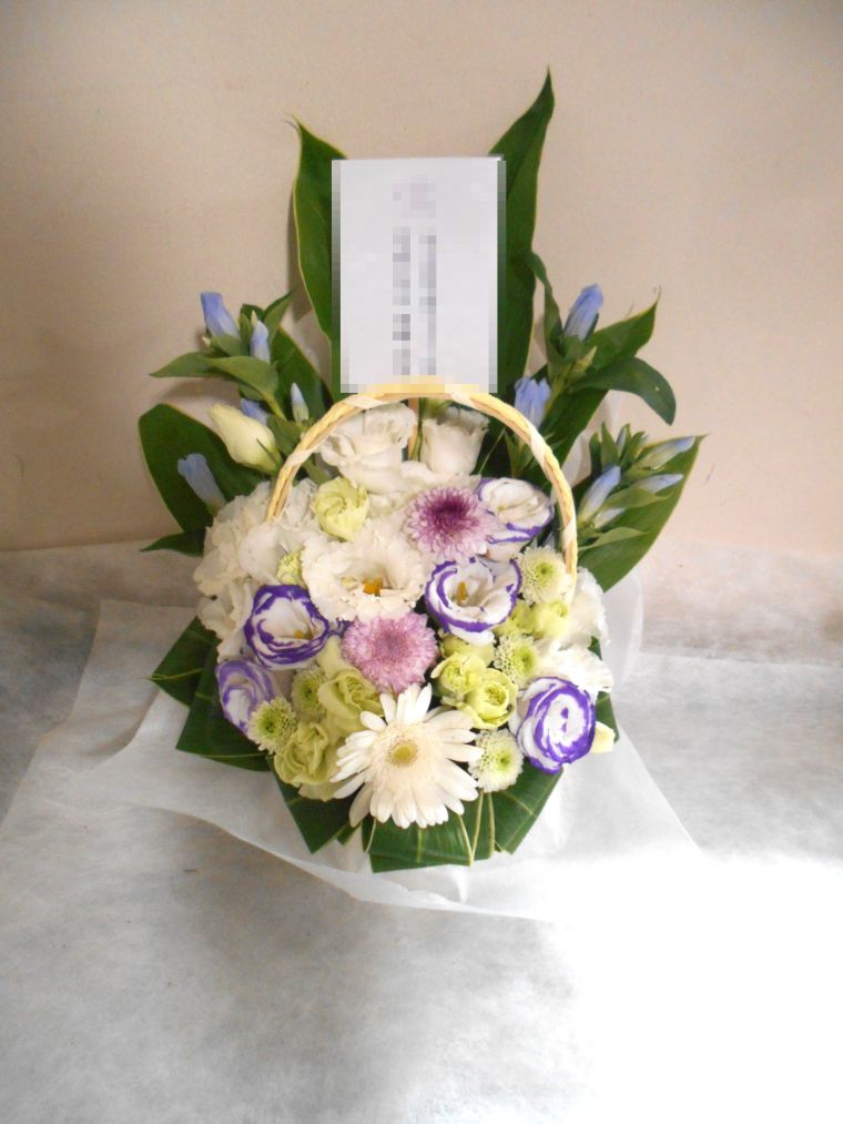 お悔やみ お供えの花 供花 (ホワイト&青・紫系カラーのお花でまとめたバスケットアレンジ)