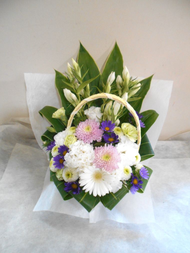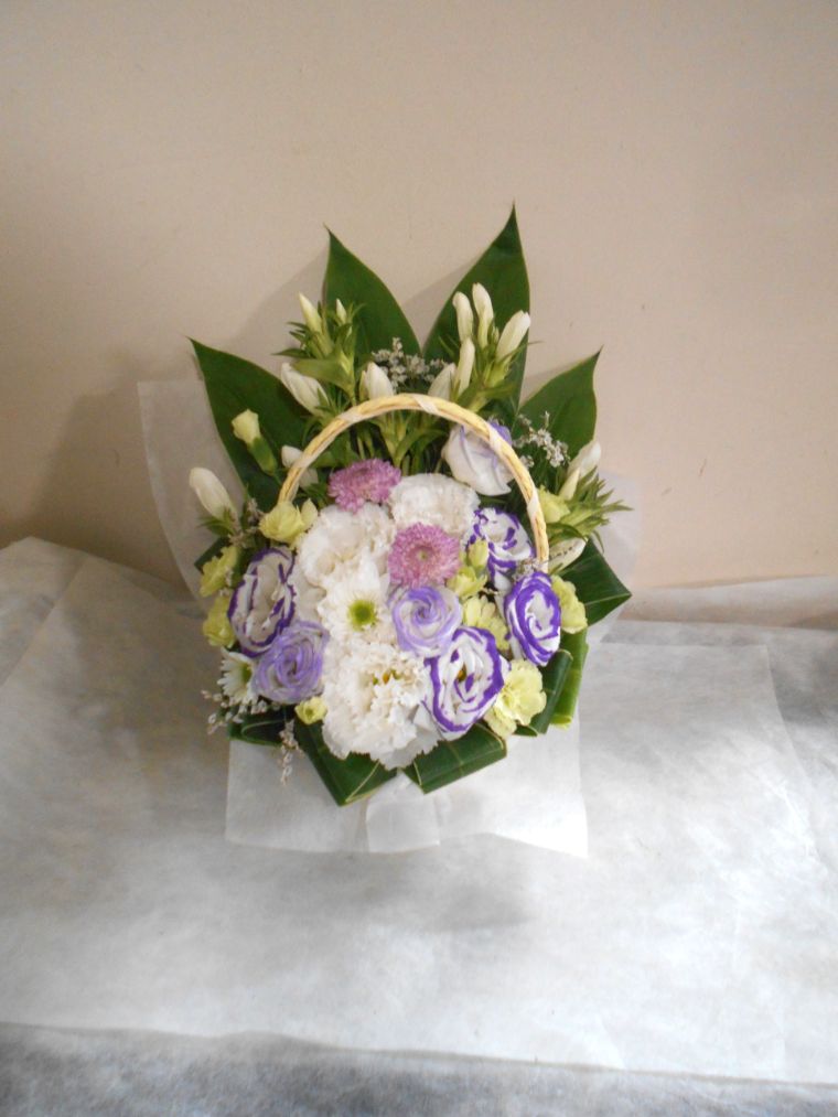 お悔やみ お供えの花 供花 (ホワイト&淡色カラーの手付きバスケットアレンジ)
