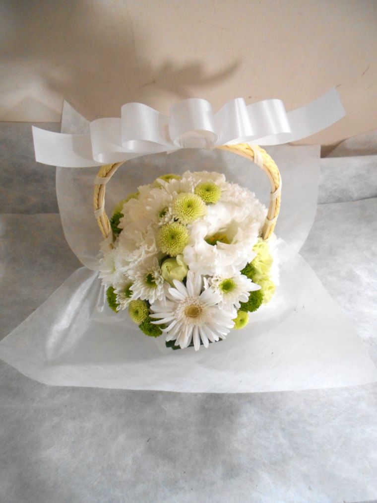 お悔やみ お供えの花 供花 (ホワイト&グリーンを基調にした手付きバスケットアレンジ)