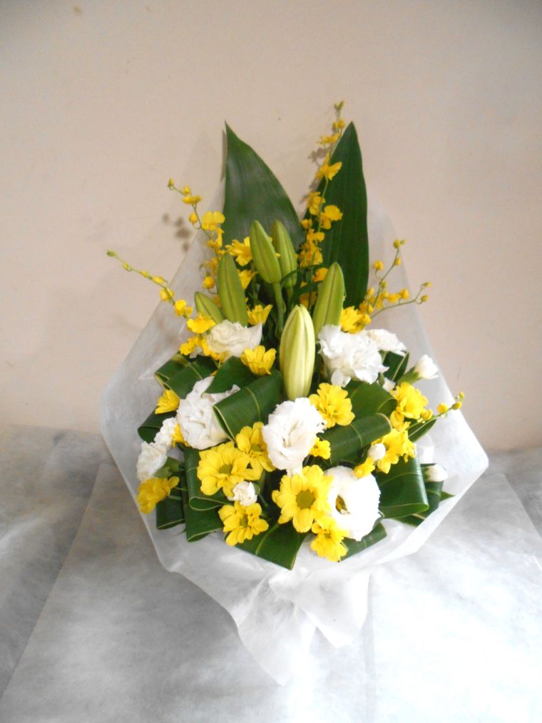 お悔やみ お供えの花 供花 (白ユリをメインに黄色の洋蘭をあしらったバスケットアレンジ)