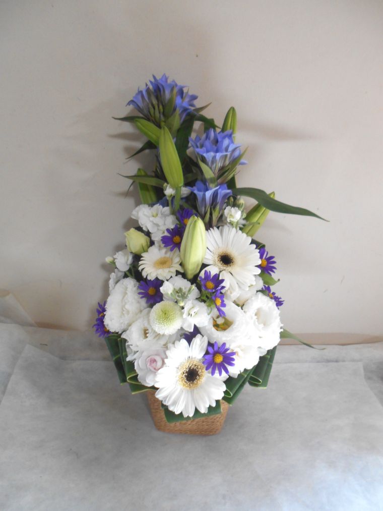 お悔やみ お供えの花 供花 (ホワイトにブルー系の挿し色を添えたバスケットアレンジ)