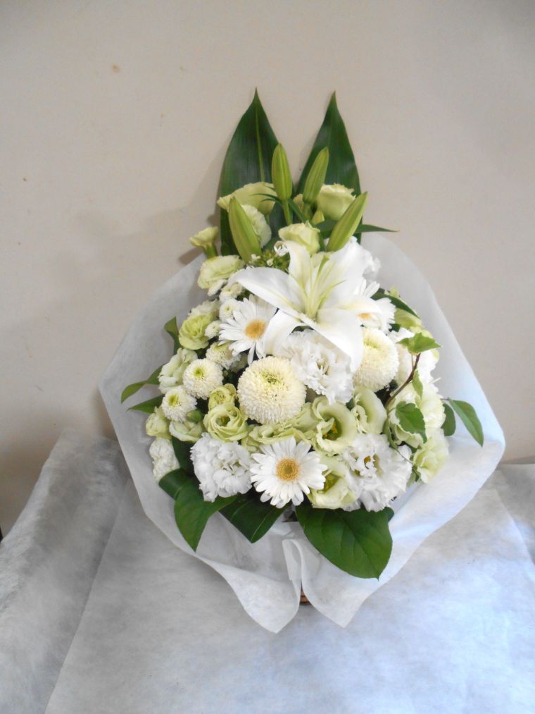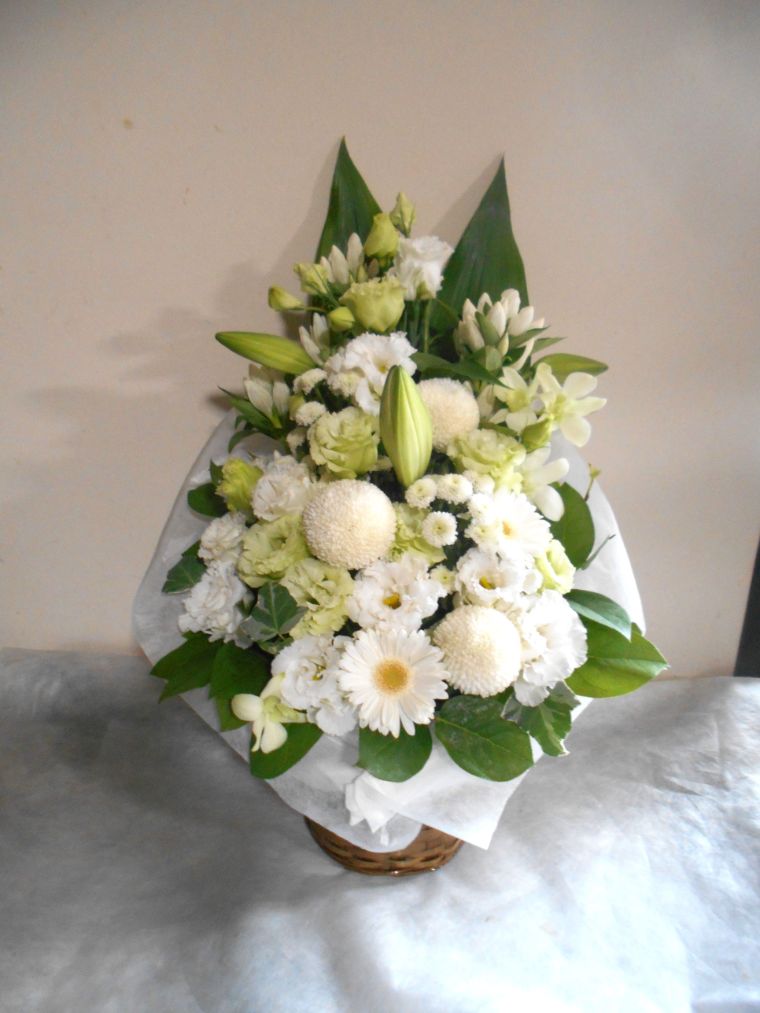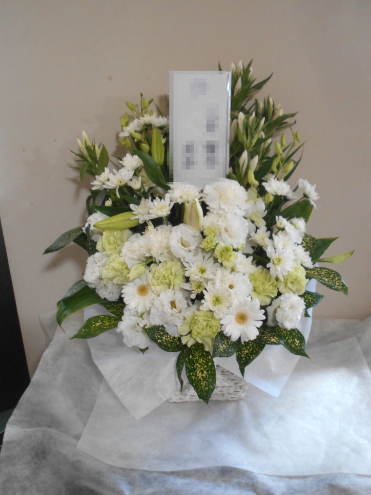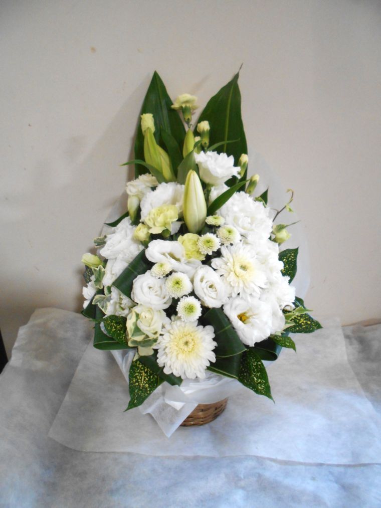 お悔やみ お供えの花 供花 (白ユリをメインにホワイト&グリーンでまとめたバスケットアレンジ)