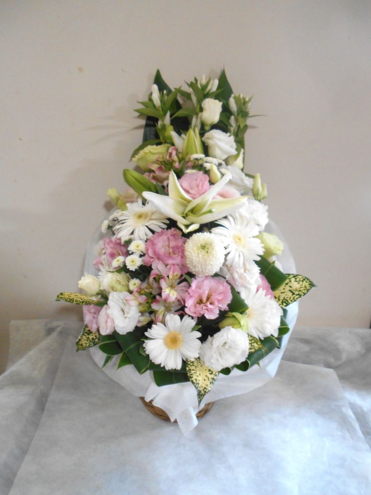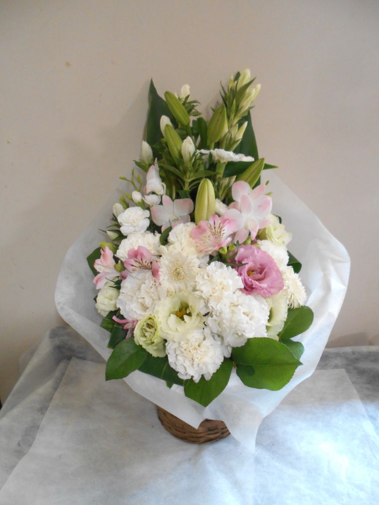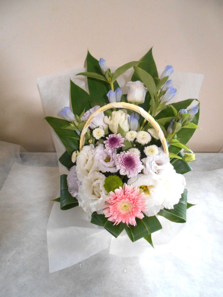 お悔やみ お供えの花 供花 (ホワイト&淡色カラーの手付きバスケットアレンジ)