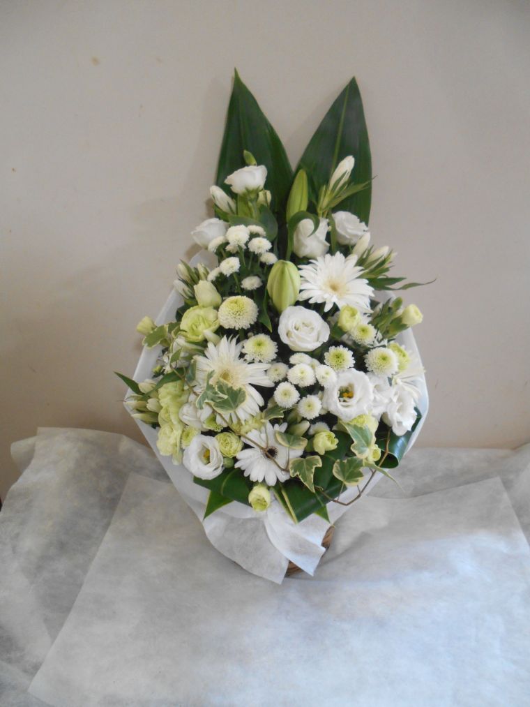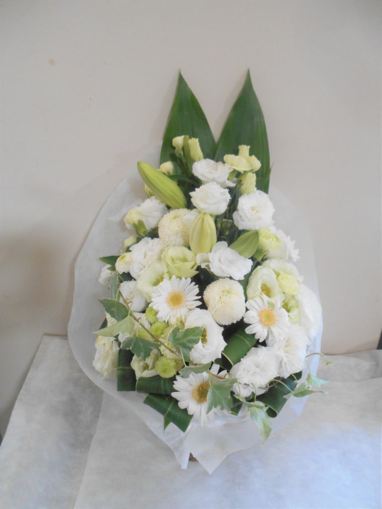 【白系】お悔やみ お供えの花 供花 (ホワイト&淡色カラーの手付きバスケットアレンジ)