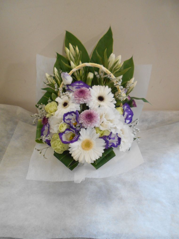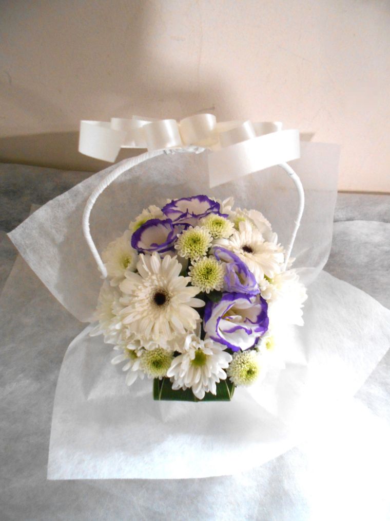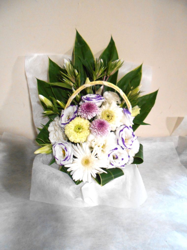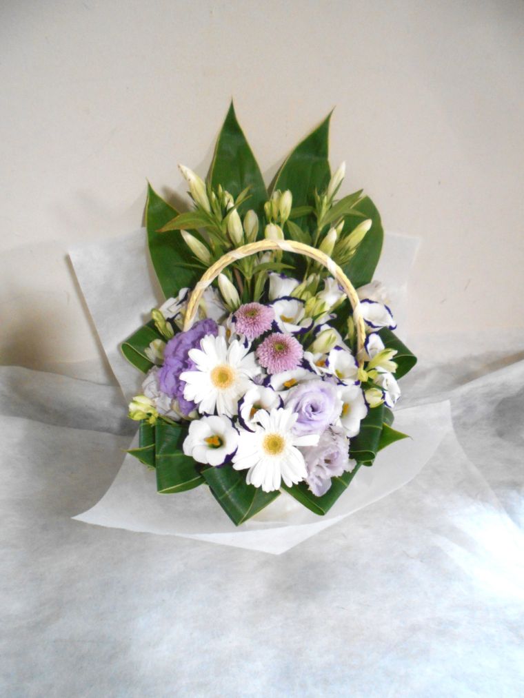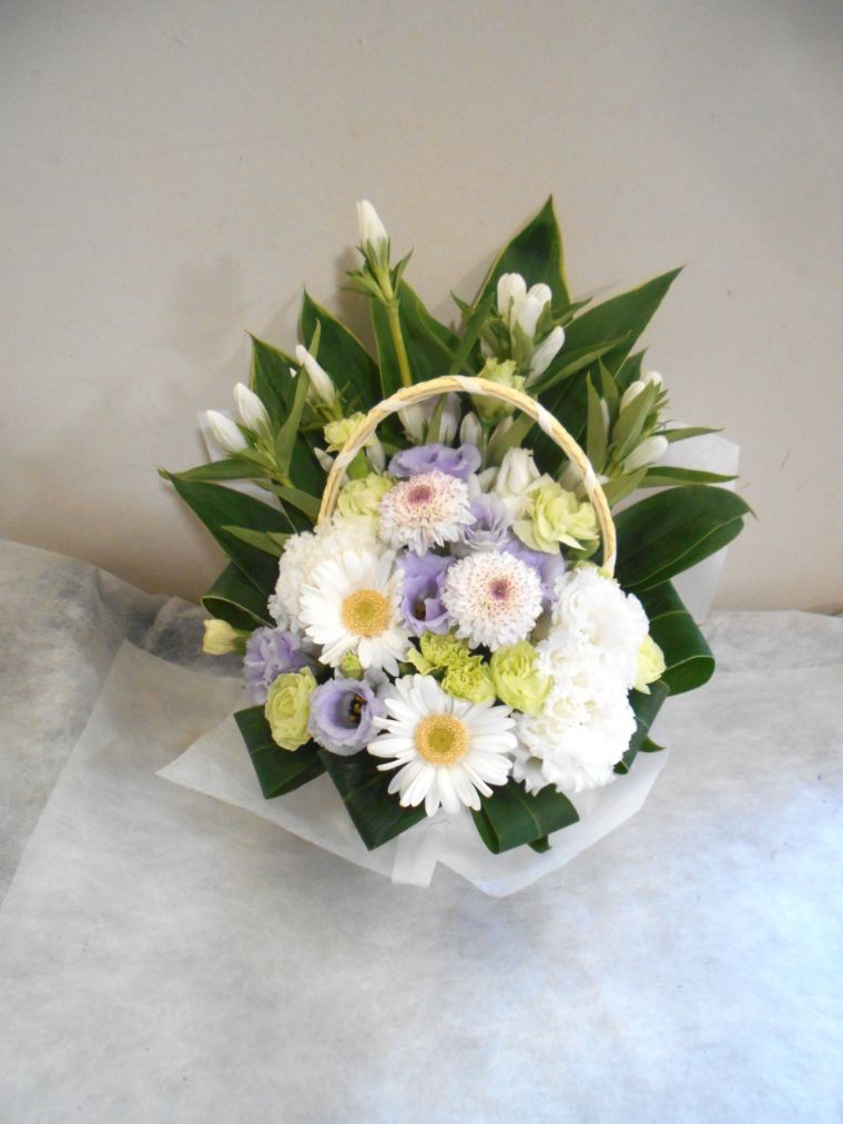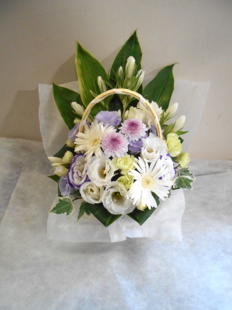 お悔やみ お供えの花 供花 (ホワイト&薄紫系でまとめた手付きのバスケットアレンジ)