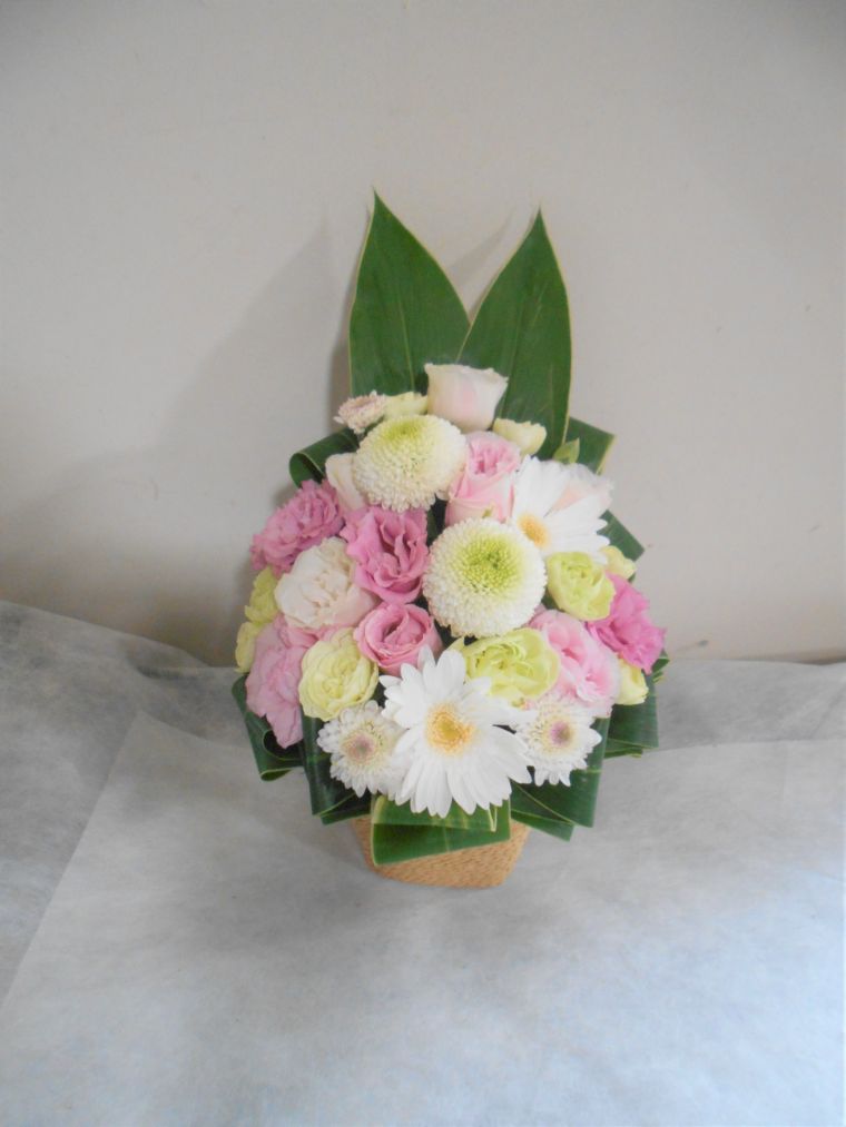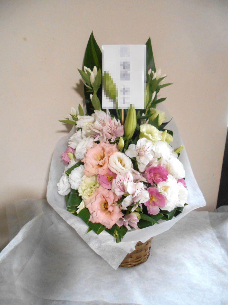お悔やみ お供えの花 供花 (ホワイト&ピンクでまとめたバスケットアレンジ)