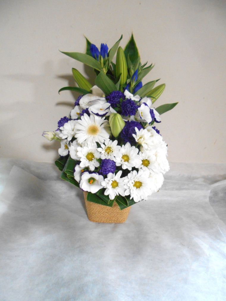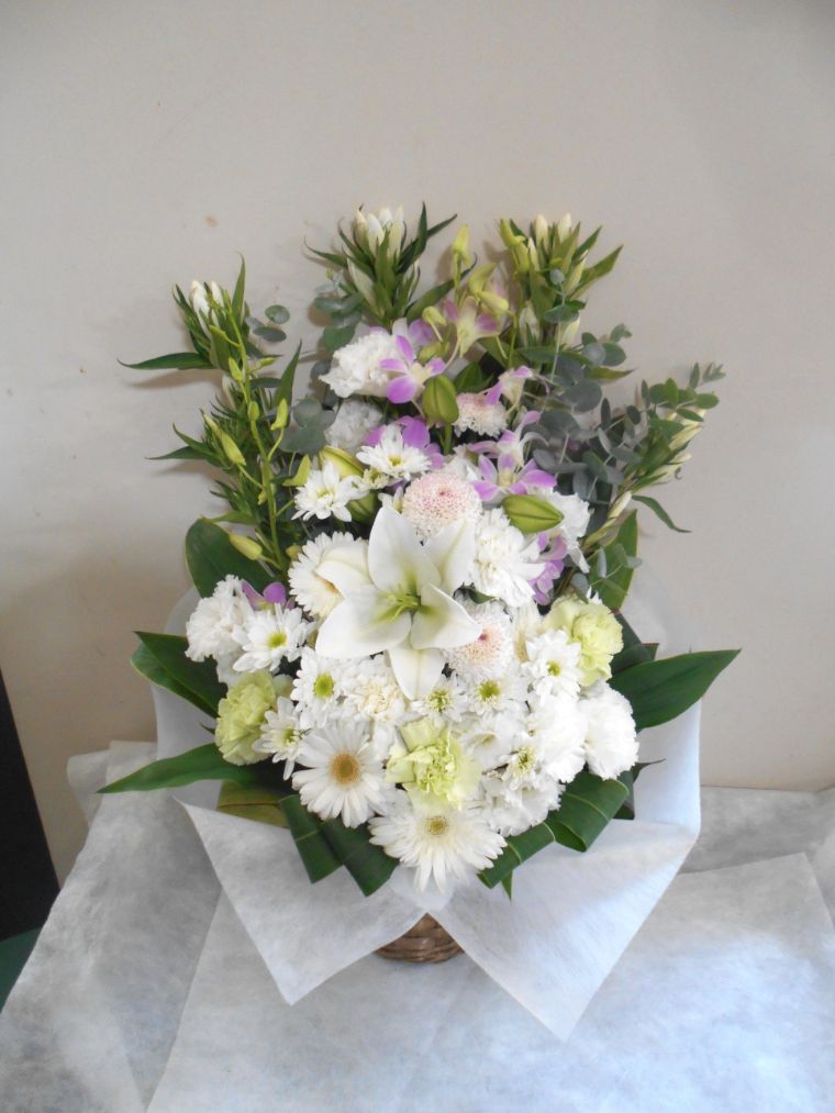 お悔やみ お供えの花 供花 (白ユリをメインにホワイト系にまとめた高さのあるバスケットアレンジ)