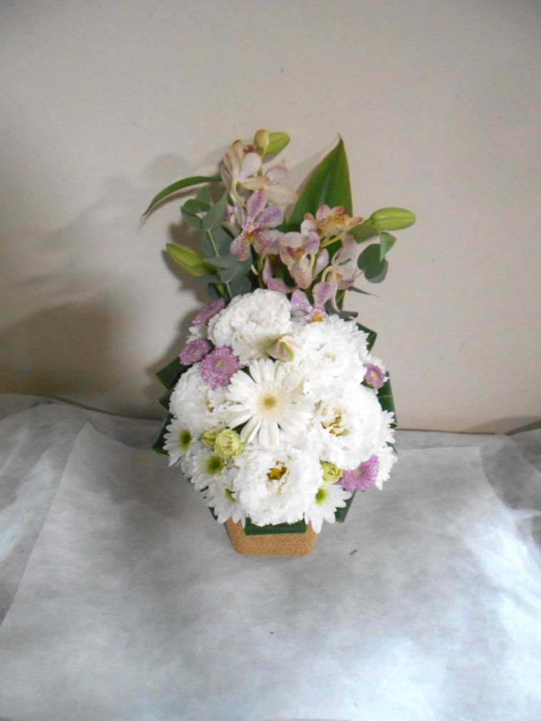 お悔やみ お供えの花 供花 (白ユリをメインにホワイト&ピンクでまとめたバスケットアレンジ)