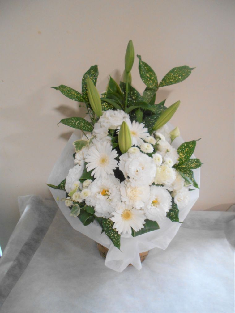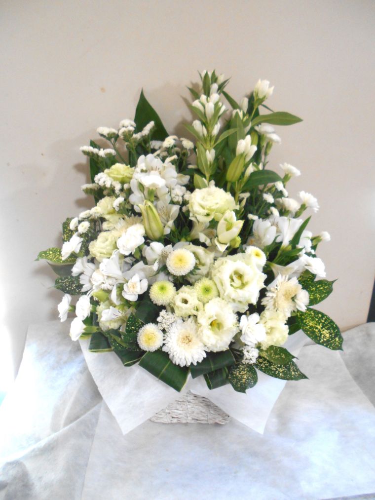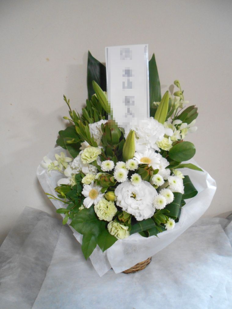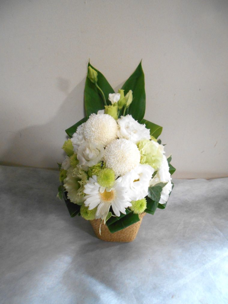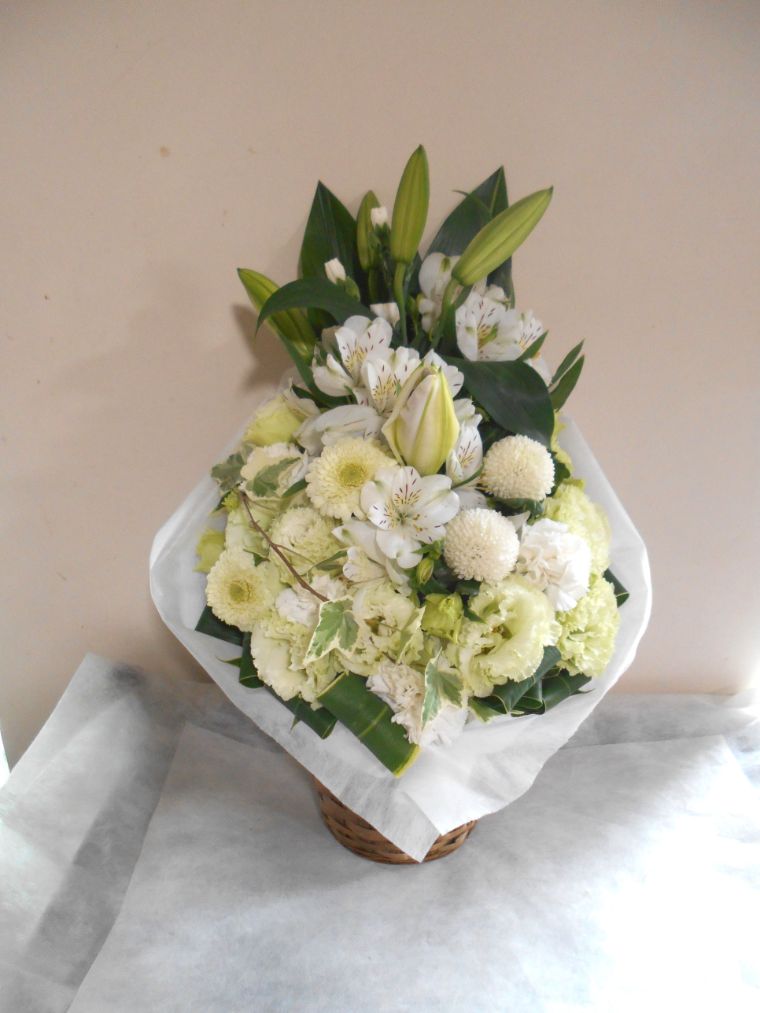お悔やみ お供えの花 供花 (ホワイト&グリーンでまとめたバスケットアレンジ)