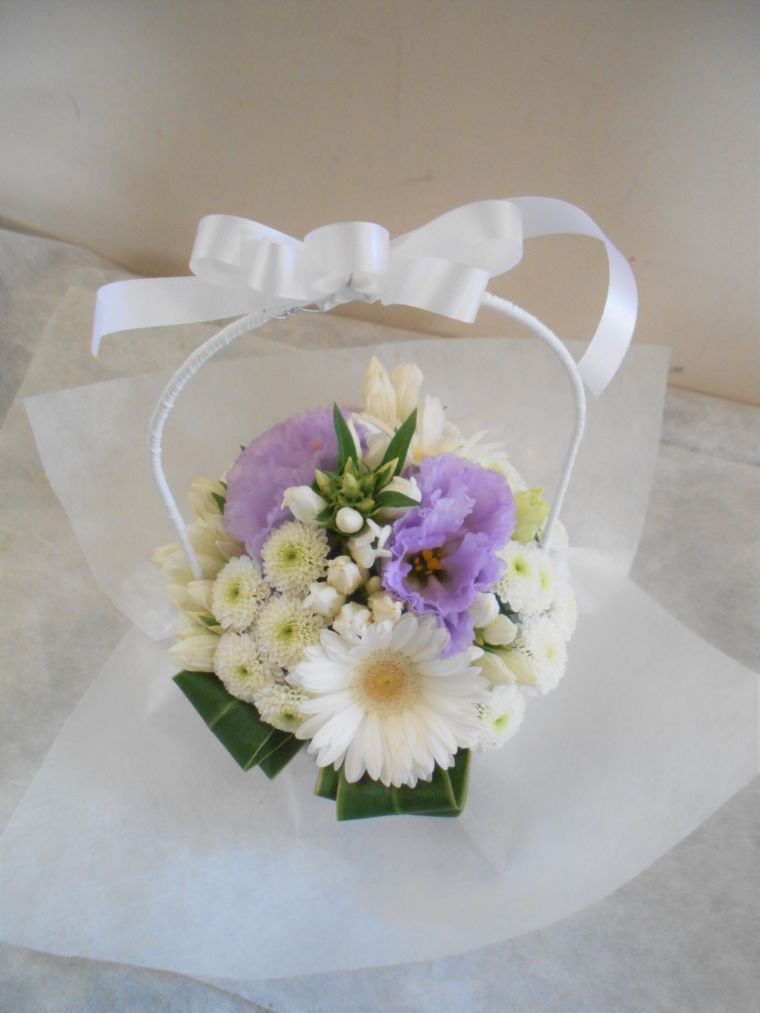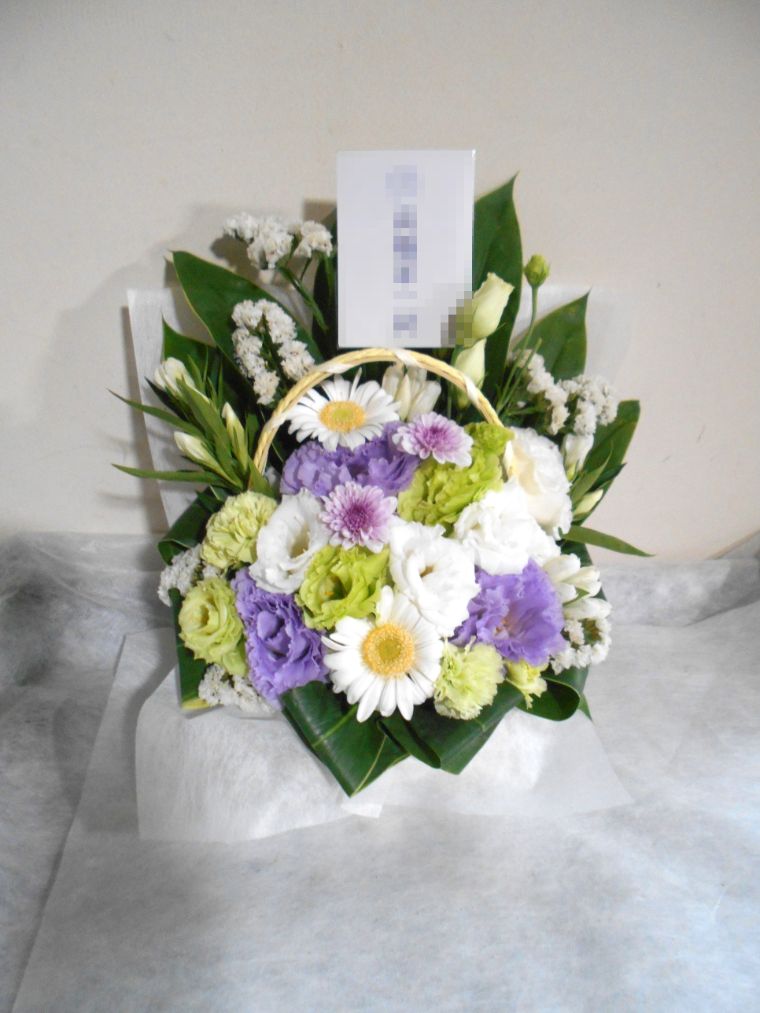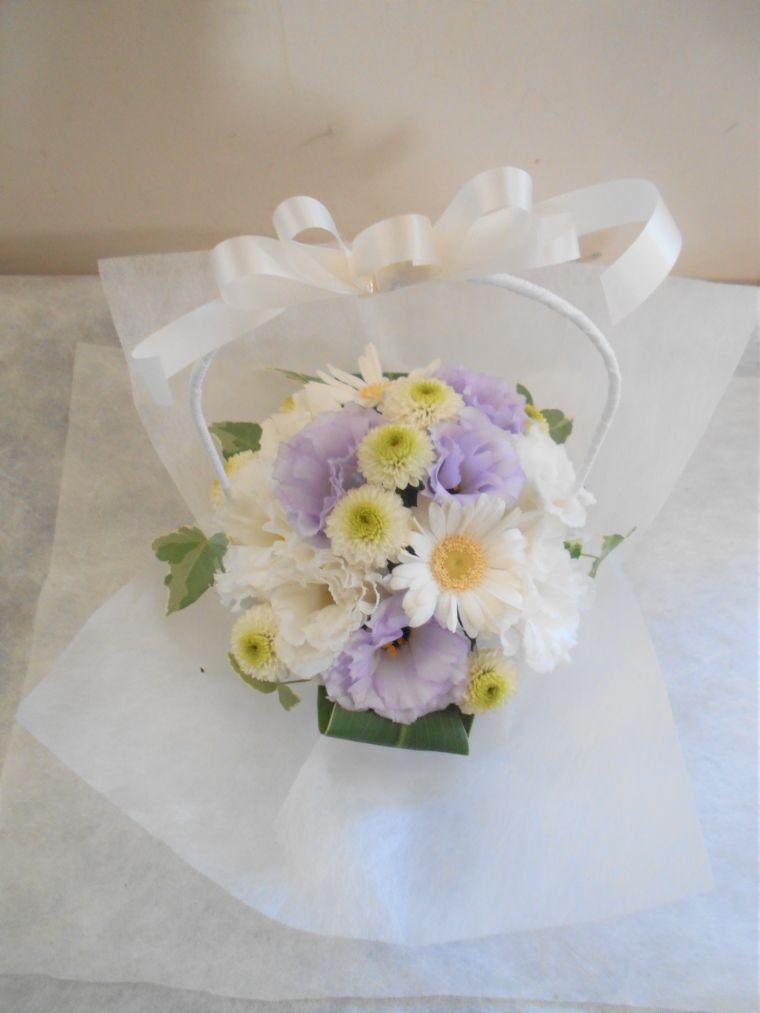 お悔やみ お供えの花 供花 (ホワイト&薄紫系でまとめた手付きのバスケットアレンジ)