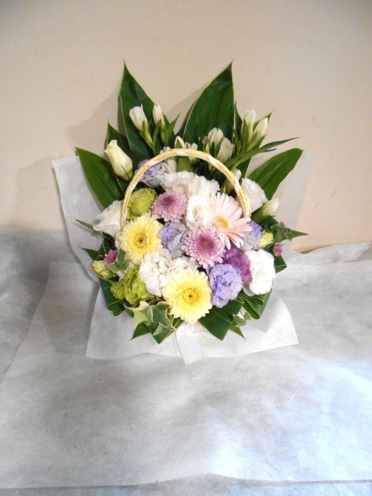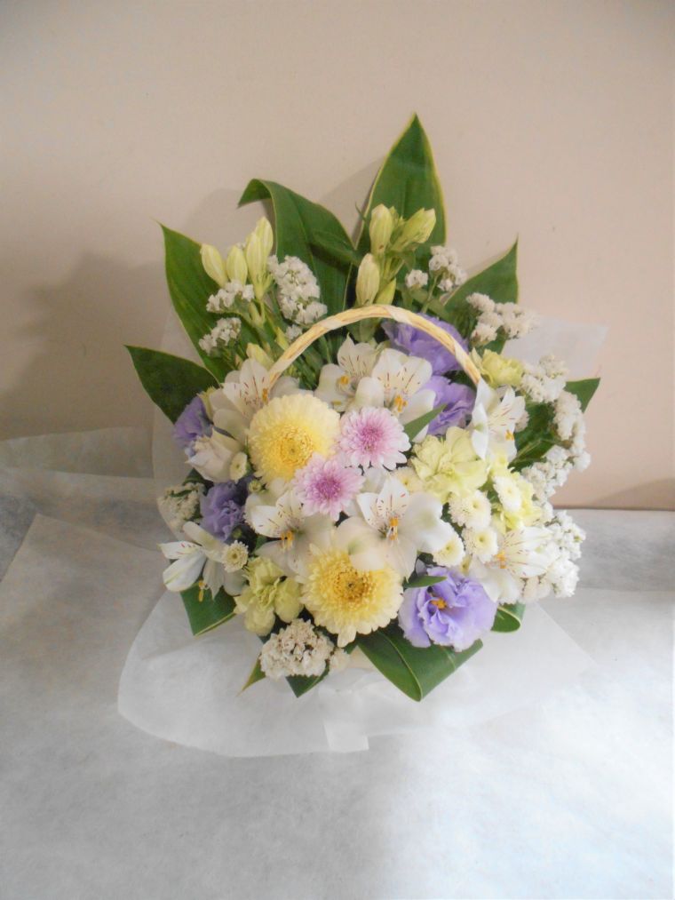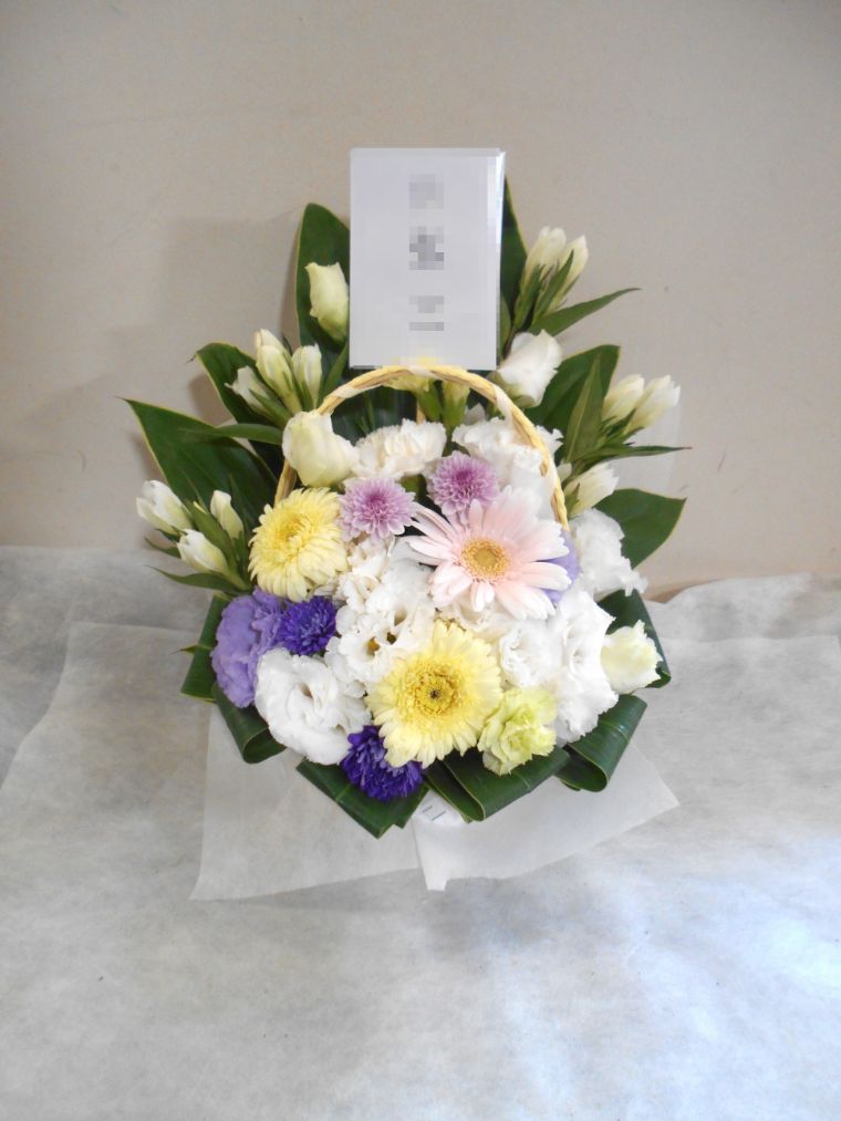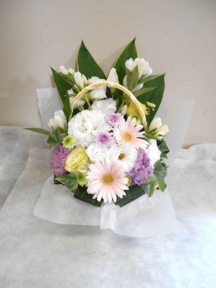 お悔やみ お供えの花 供花 (ホワイト&淡色カラーの手付きバスケットアレンジ)