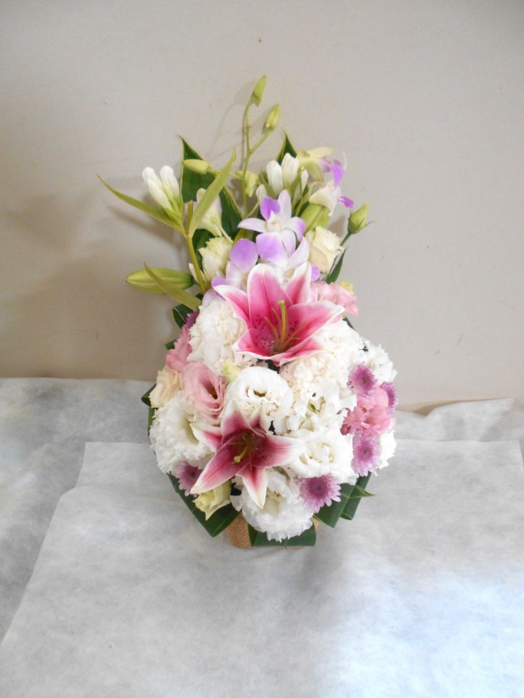 お悔やみ お供えの花 供花 (ユリをメインに白&ピンクでまとめたバスケットアレンジ)